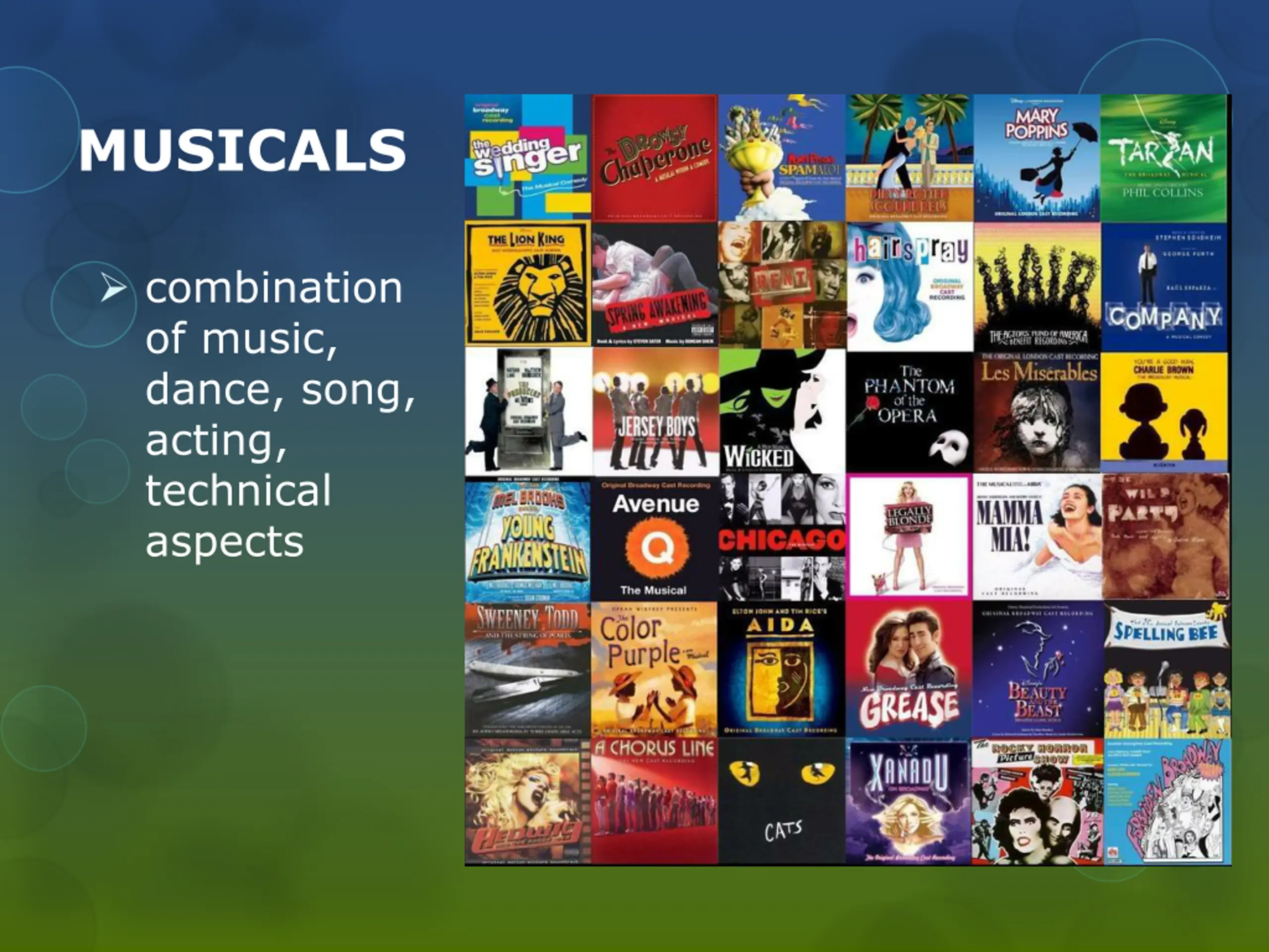 MUSICALS combination of music, dance, song, acting, technical aspects