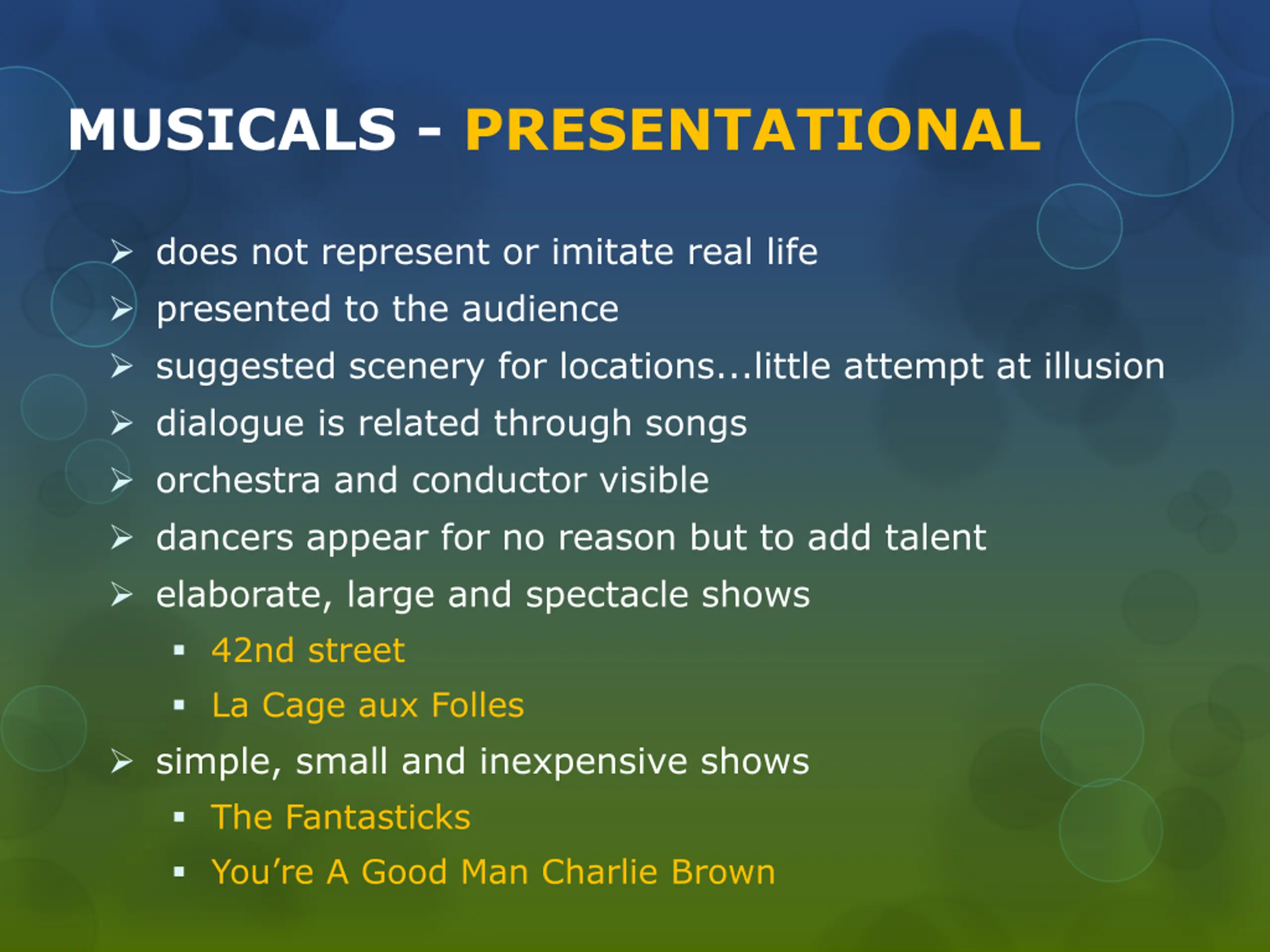 MUSICALS - PRESENTATIONAL does not represent or imitate real life presented to the audience suggested scenery for locations...little attempt at illusion dialogue is related through songs orchestra and conductor visible dancers appear for no reason but to add talent elaborate, large and spectacle shows 42nd street La Cage aux Folles simple, small and inexpensive shows The Fantasticks You re A Good Man Charlie Brown