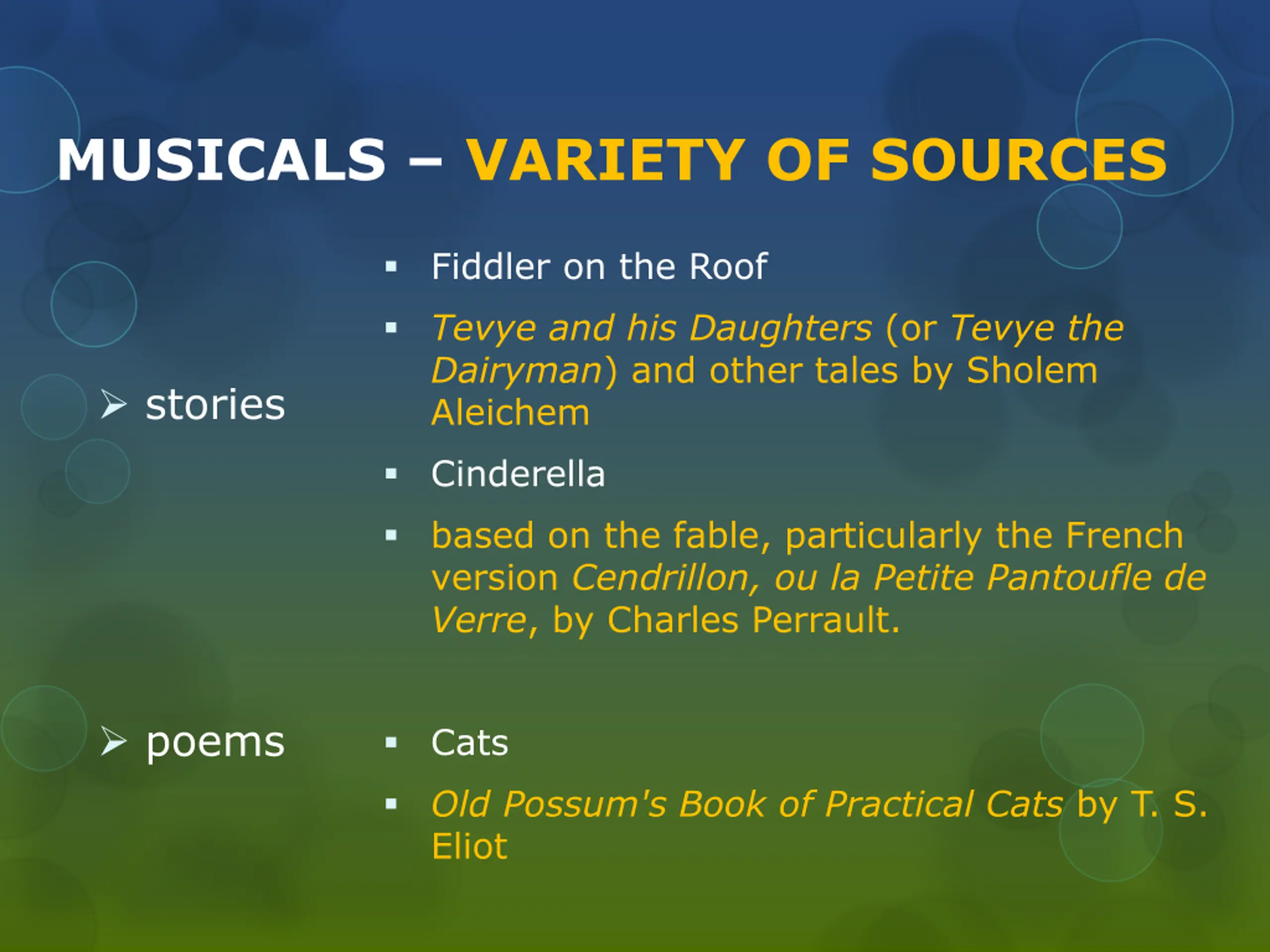 MUSICALS VARIETY OF SOURCES Fiddler on the Roof Tevye and his Daughters (or Tevye the Dairyman) and other tales by Sholem Aleichem stories Cinderella based on the fable, particularly the French version Cendrillon, ou la Petite Pantoufle de Verre, by Charles Perrault. poems Cats Old Possum's Book of Practical Cats by T. S. Eliot