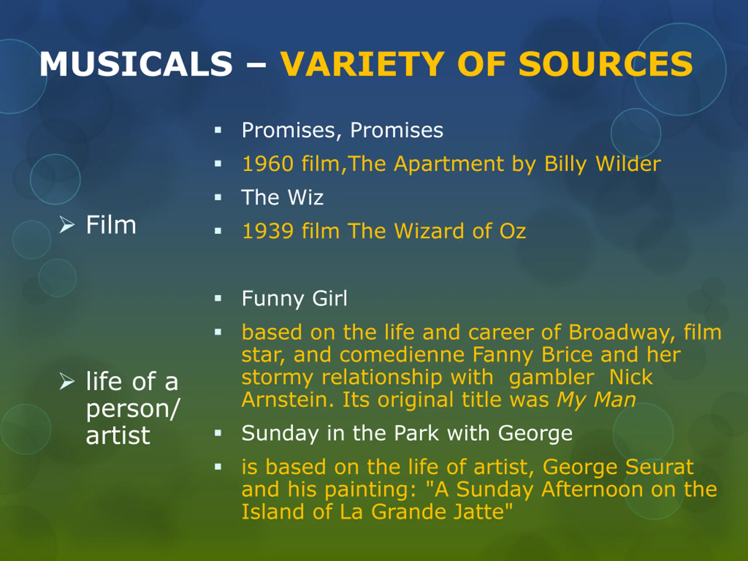 MUSICALS VARIETY OF SOURCES Promises, Promises 1960 film,The Apartment by Billy Wilder The Wiz 1939 film The Wizard of Oz Film Funny Girl based on the life and career of Broadway, film star, and comedienne Fanny Brice and her stormy relationship with gambler Nick Arnstein. Its original title was My Man Sunday in the Park with George is based on the life of artist, George Seurat and his painting: "A Sunday Afternoon on the Island of La Grande Jatte" life of a person/ artist