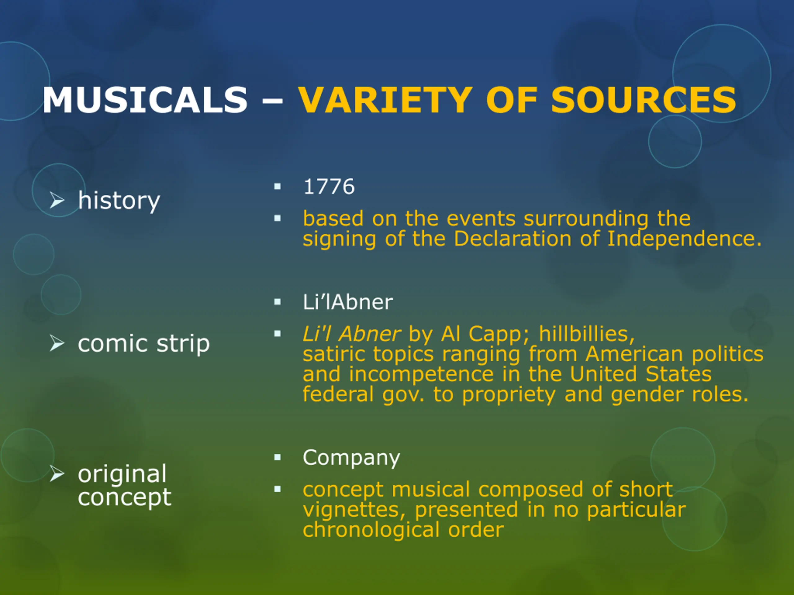 MUSICALS VARIETY OF SOURCES 1776 based on the events surrounding the signing of the Declaration of Independence. history Li lAbner Li'l Abner by Al Capp; hillbillies, satiric topics ranging from American politics and incompetence in the United States federal gov. to propriety and gender roles. comic strip Company concept musical composed of short vignettes, presented in no particular chronological order original concept