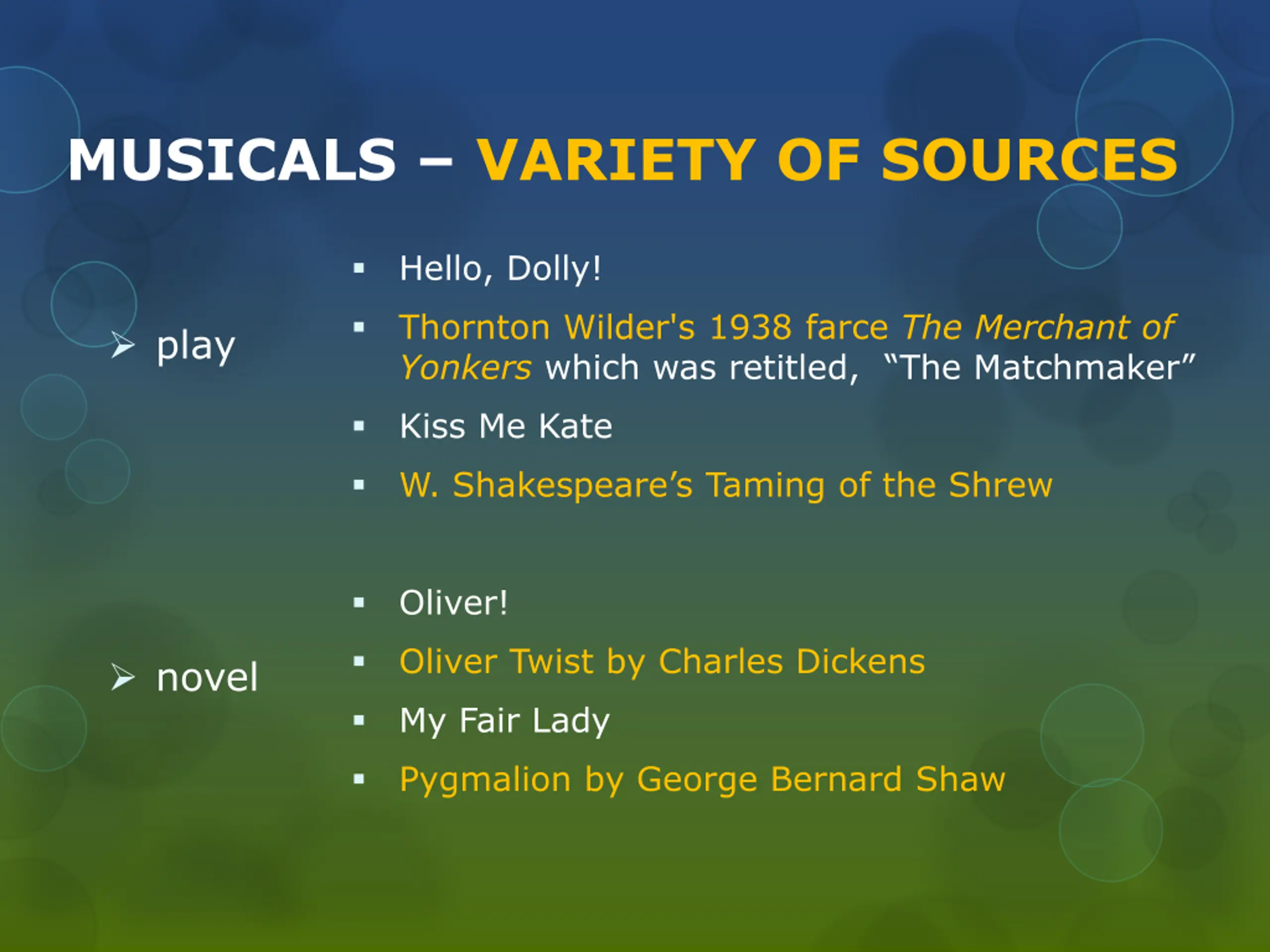 MUSICALS VARIETY OF SOURCES Hello, Dolly! Thornton Wilder's 1938 farce The Merchant of Yonkerswhich was retitled, The Matchmaker play Kiss Me Kate W. Shakespeare s Taming of the Shrew Oliver! Oliver Twist by Charles Dickens novel My Fair Lady Pygmalion by George Bernard Shaw
