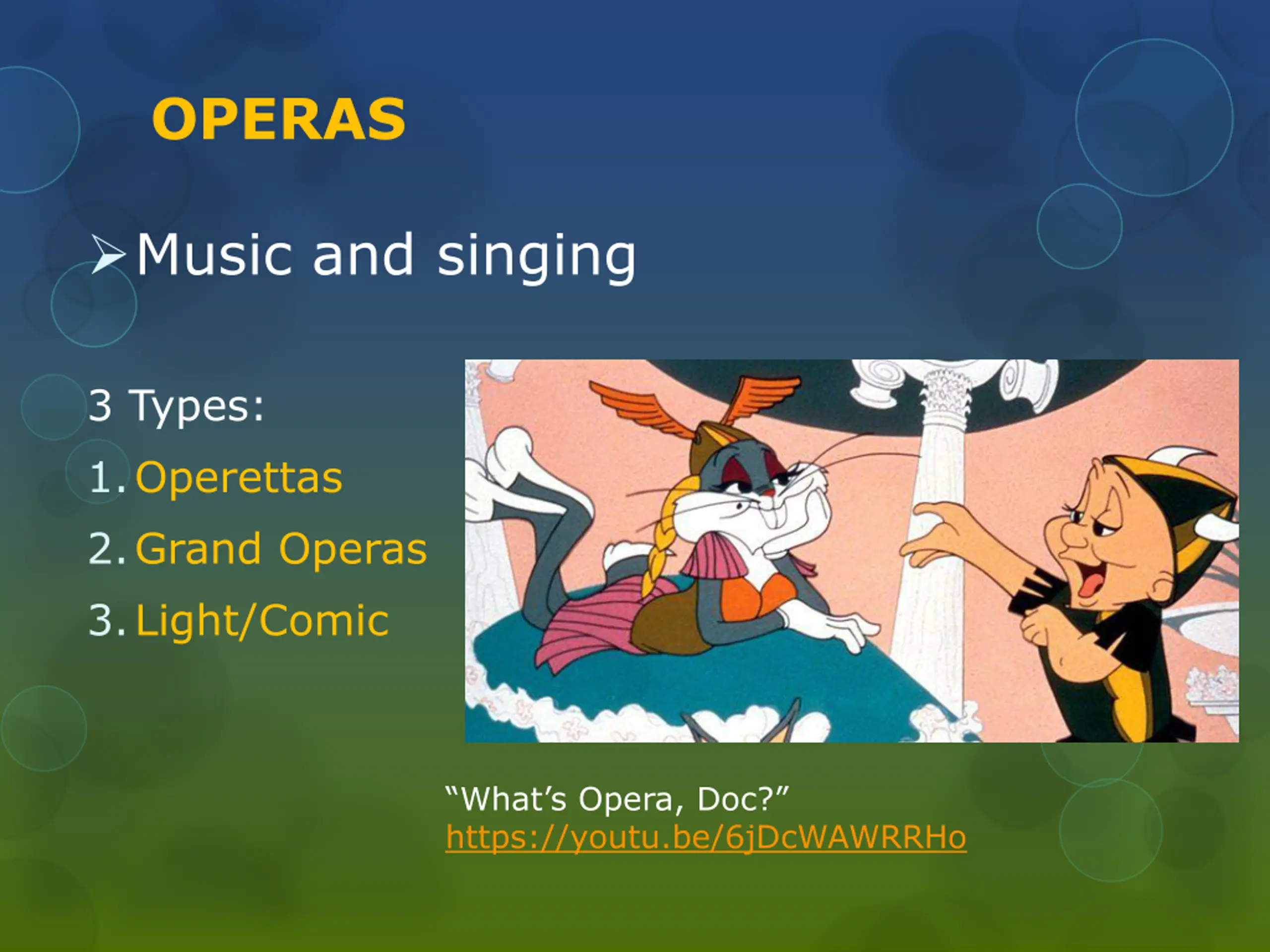 OPERAS Music and singing 3 Types: 1.Operettas 2.Grand Operas 3.Light/Comic What s Opera, Doc? https://youtu.be/6jDcWAWRRHo