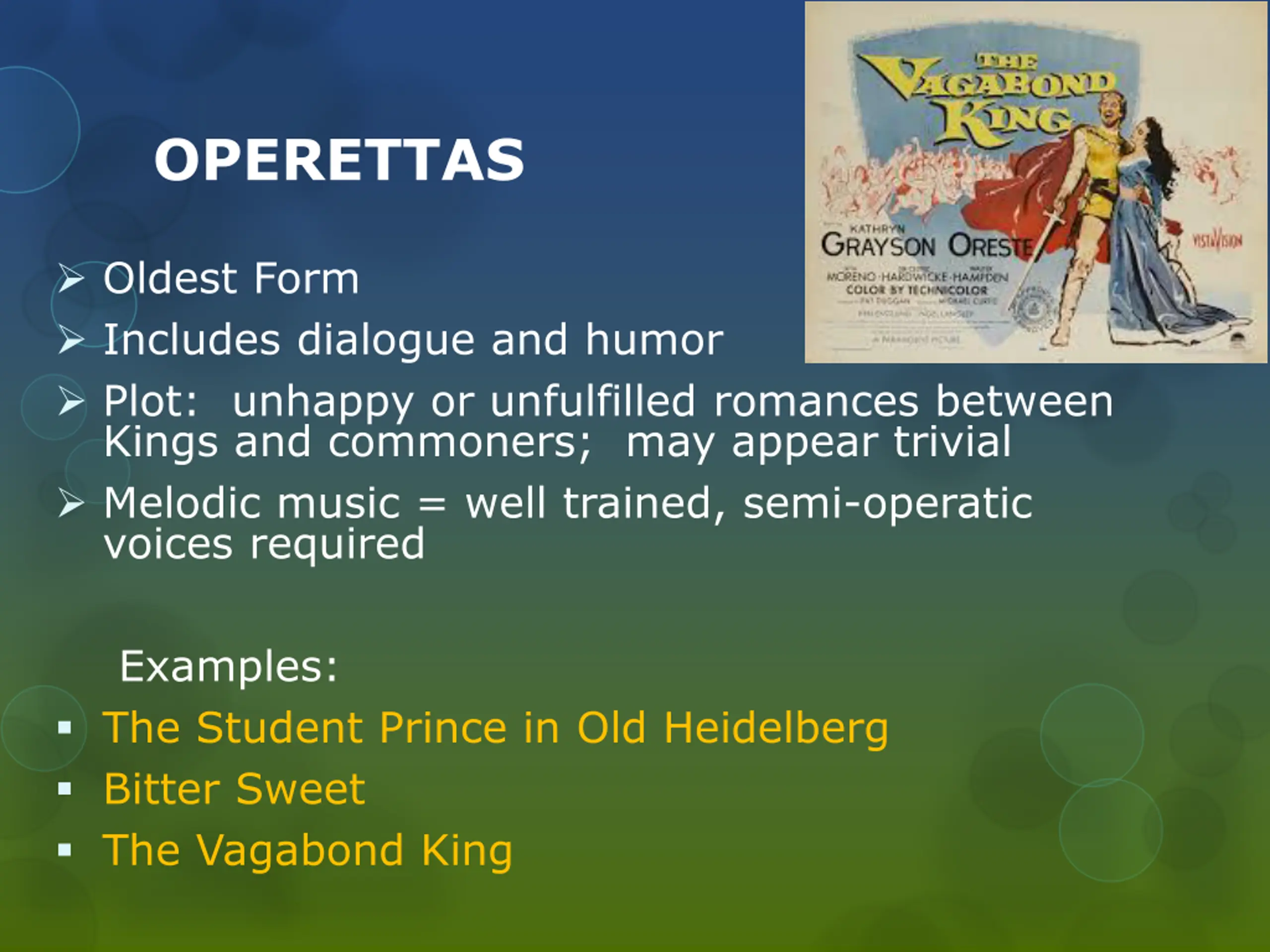 OPERETTAS Oldest Form Includes dialogue and humor Plot: unhappy or unfulfilled romances between Kings and commoners; may appear trivial Melodic music = well trained, semi-operatic voices required The Student Prince in Old Heidelberg Bitter Sweet The Vagabond King Examples:
