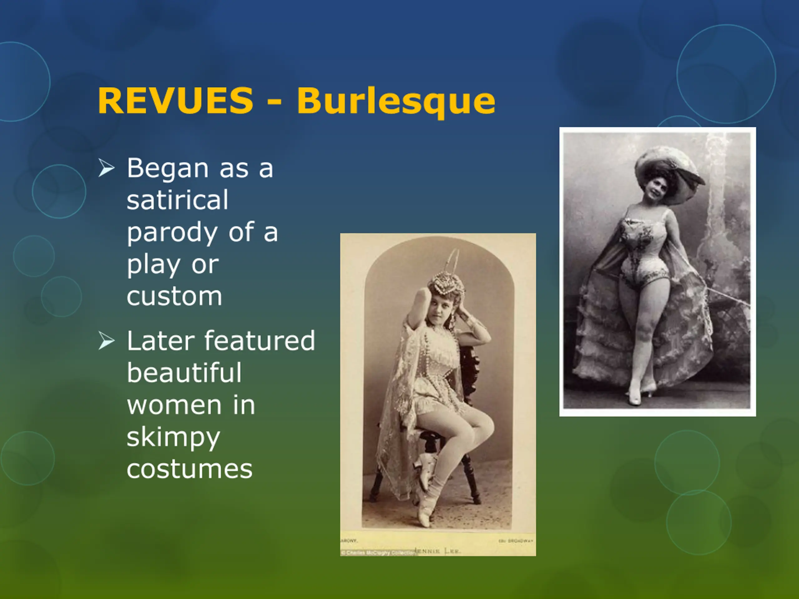 REVUES - Burlesque Began as a satirical parody of a play or custom Later featured beautiful women in skimpy costumes