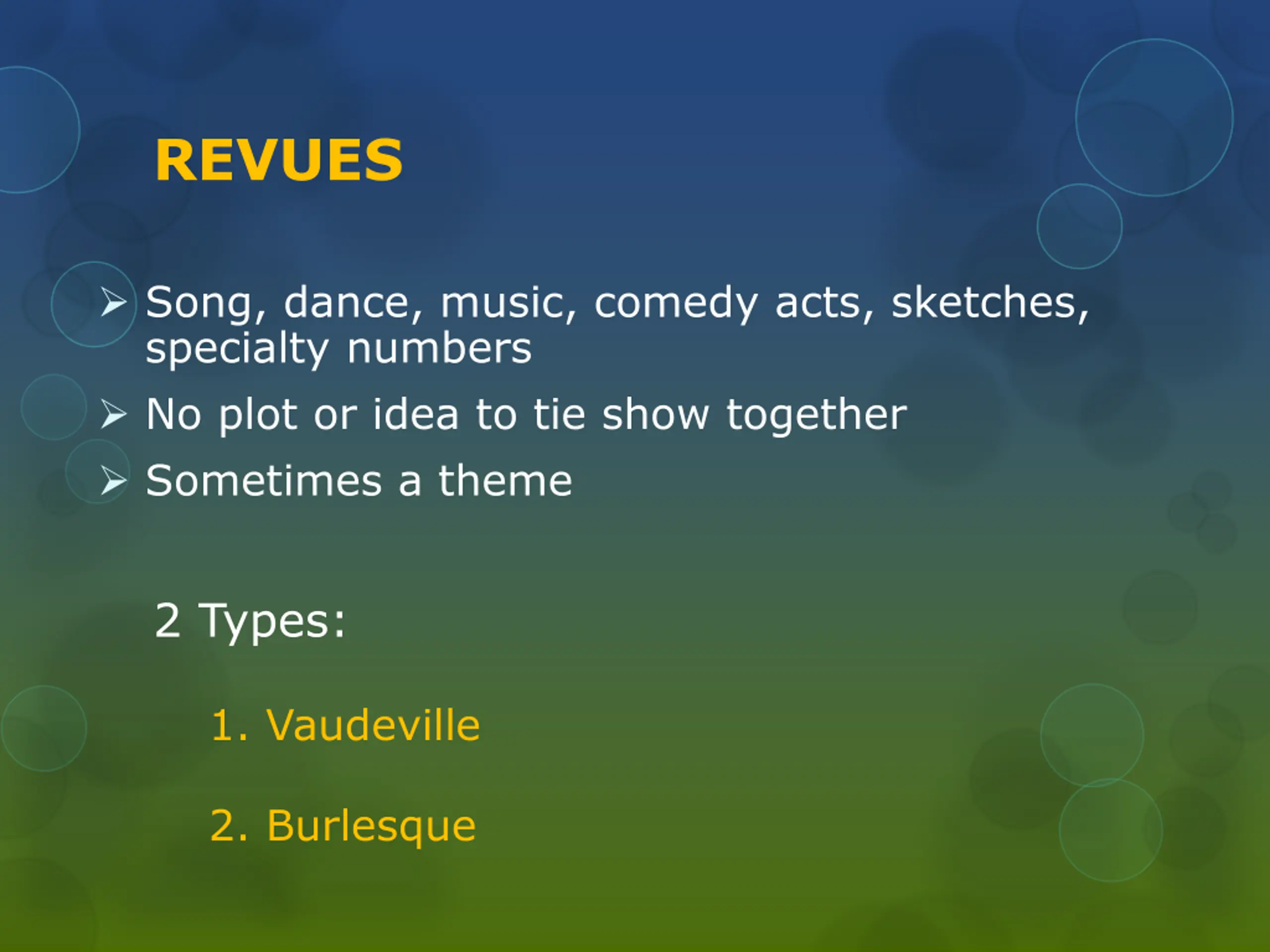 REVUES Song, dance, music, comedy acts, sketches, specialty numbers No plot or idea to tie show together Sometimes a theme 2 Types: 1. Vaudeville 2. Burlesque