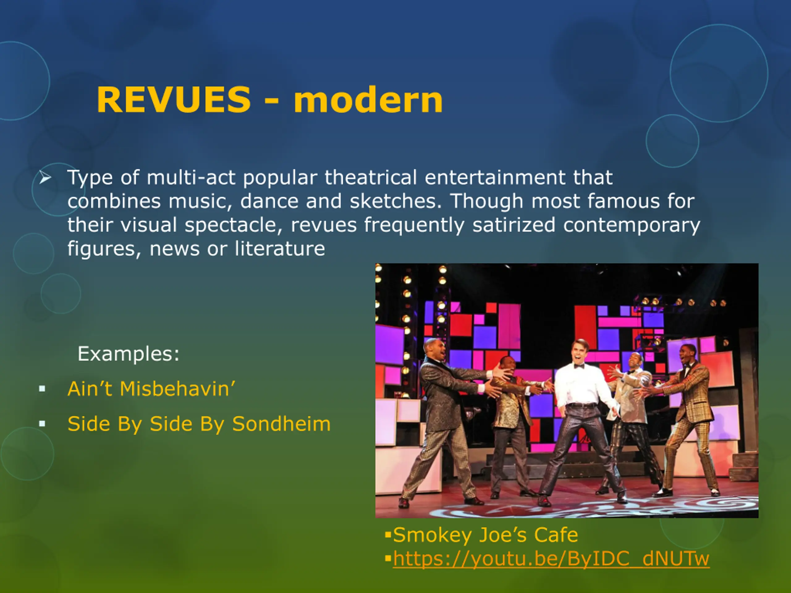 REVUES - modern Type of multi-act popular theatrical entertainment that combines music, dance and sketches. Though most famous for their visual spectacle, revues frequently satirized contemporary figures, news or literature Examples: Ain t Misbehavin Side By Side By Sondheim Smokey Joe s Cafe https://youtu.be/ByIDC_dNUTw