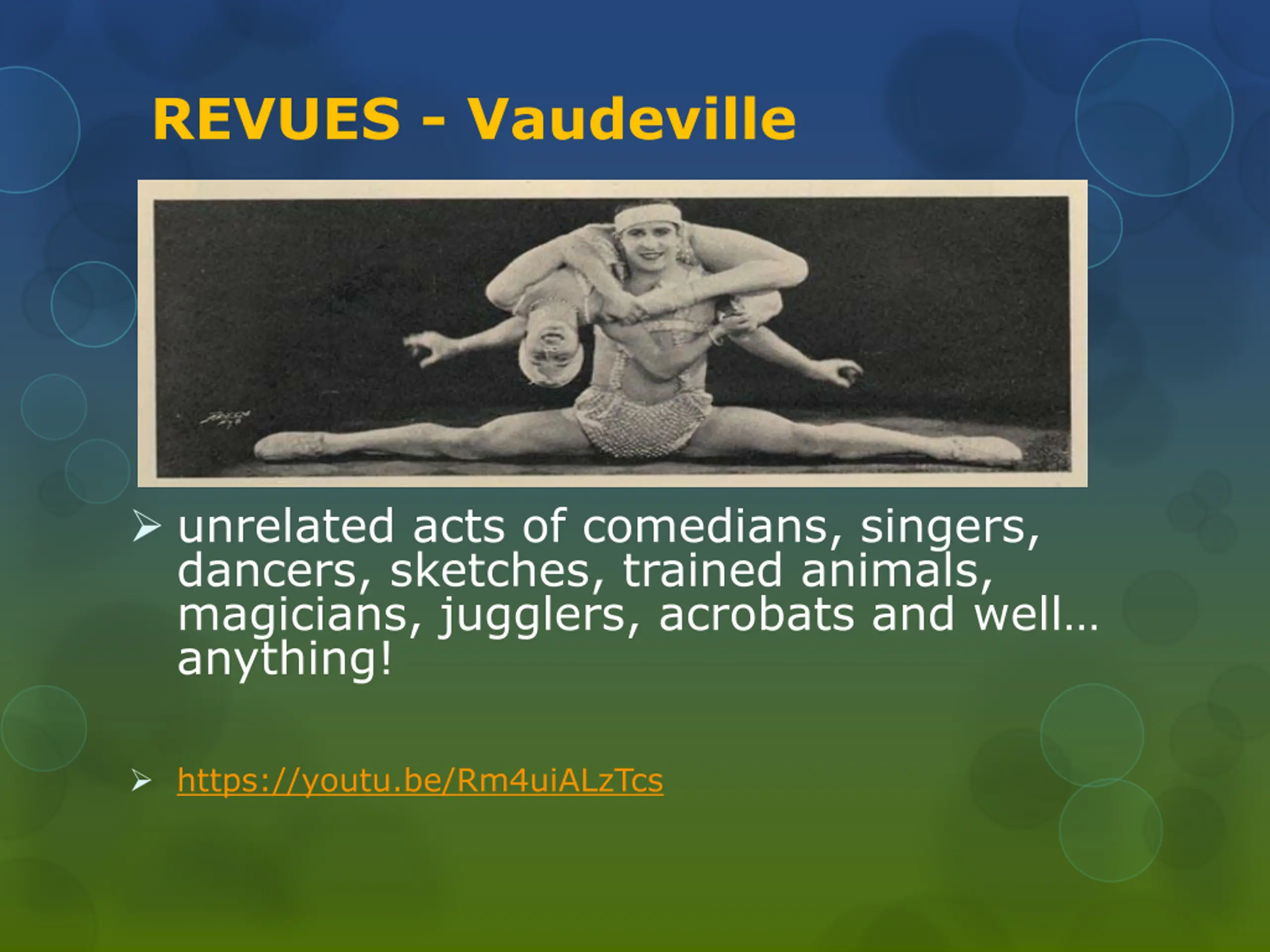 REVUES - Vaudeville unrelated acts of comedians, singers, dancers, sketches, trained animals, magicians, jugglers, acrobats and well anything! https://youtu.be/Rm4uiALzTcs