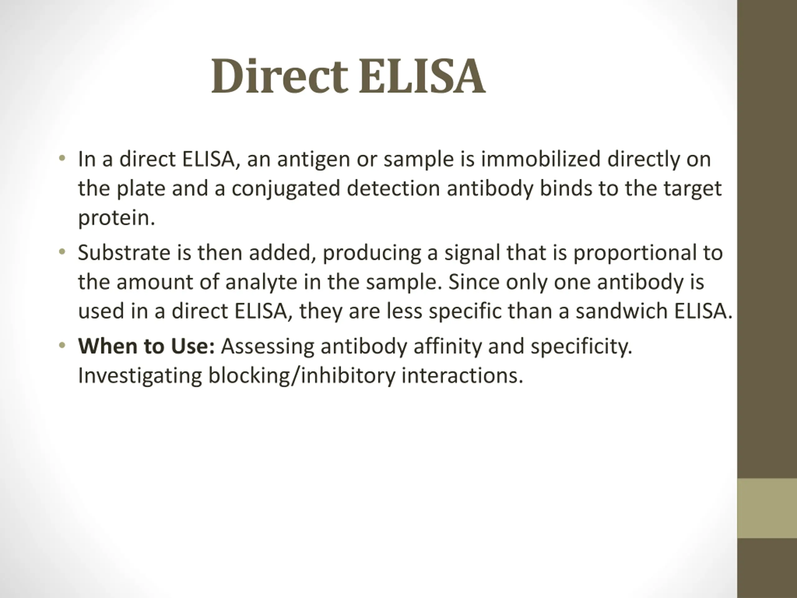 Direct ELISA In a direct ELISA, an antigen or sample is immobilized directly on the plate and a conjugated detection antibody binds to the target protein. Substrate is then added, producing a signal that is proportional to the amount of analyte in the sample. Since only one antibody is used in a direct ELISA, they are less specific than a sandwich ELISA. When to Use: Assessing antibody affinity and specificity. Investigating blocking/inhibitory interactions.