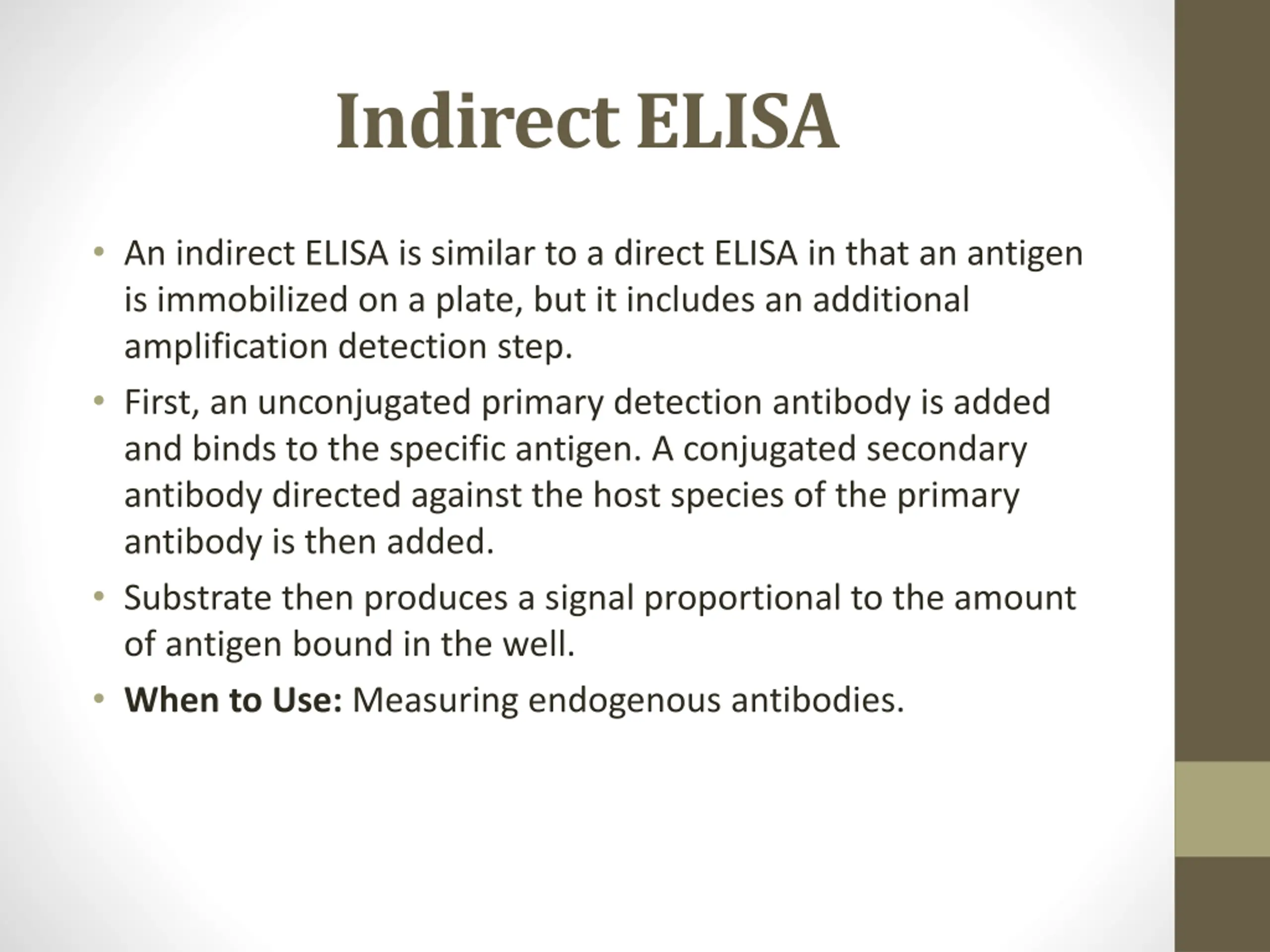 Indirect ELISA An indirect ELISA is similar to a direct ELISA in that an antigen is immobilized on a plate, but it includes an additional amplification detection step. First, an unconjugated primary detection antibody is added and binds to the specific antigen. A conjugated secondary antibody directed against the host species of the primary antibody is then added. Substrate then produces a signal proportional to the amount of antigen bound in the well. When to Use: Measuring endogenous antibodies.