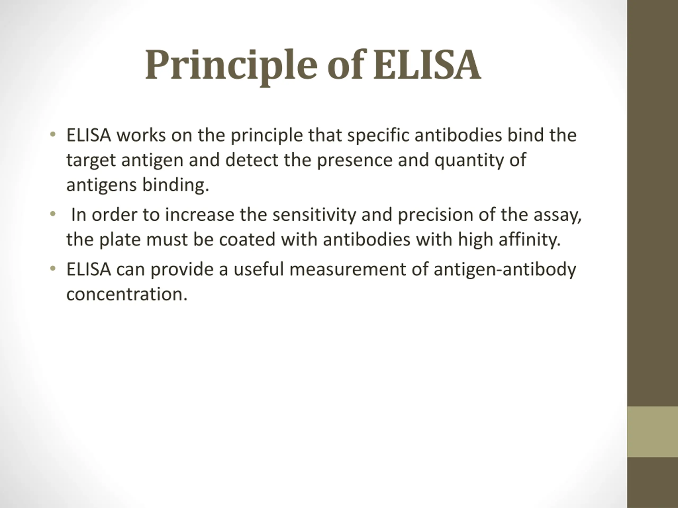 Principle of ELISA ELISA works on the principle that specific antibodies bind the target antigen and detect the presence and quantity of antigens binding. In order to increase the sensitivity and precision of the assay, the plate must be coated with antibodies with high affinity. ELISA can provide a useful measurement of antigen-antibody concentration.