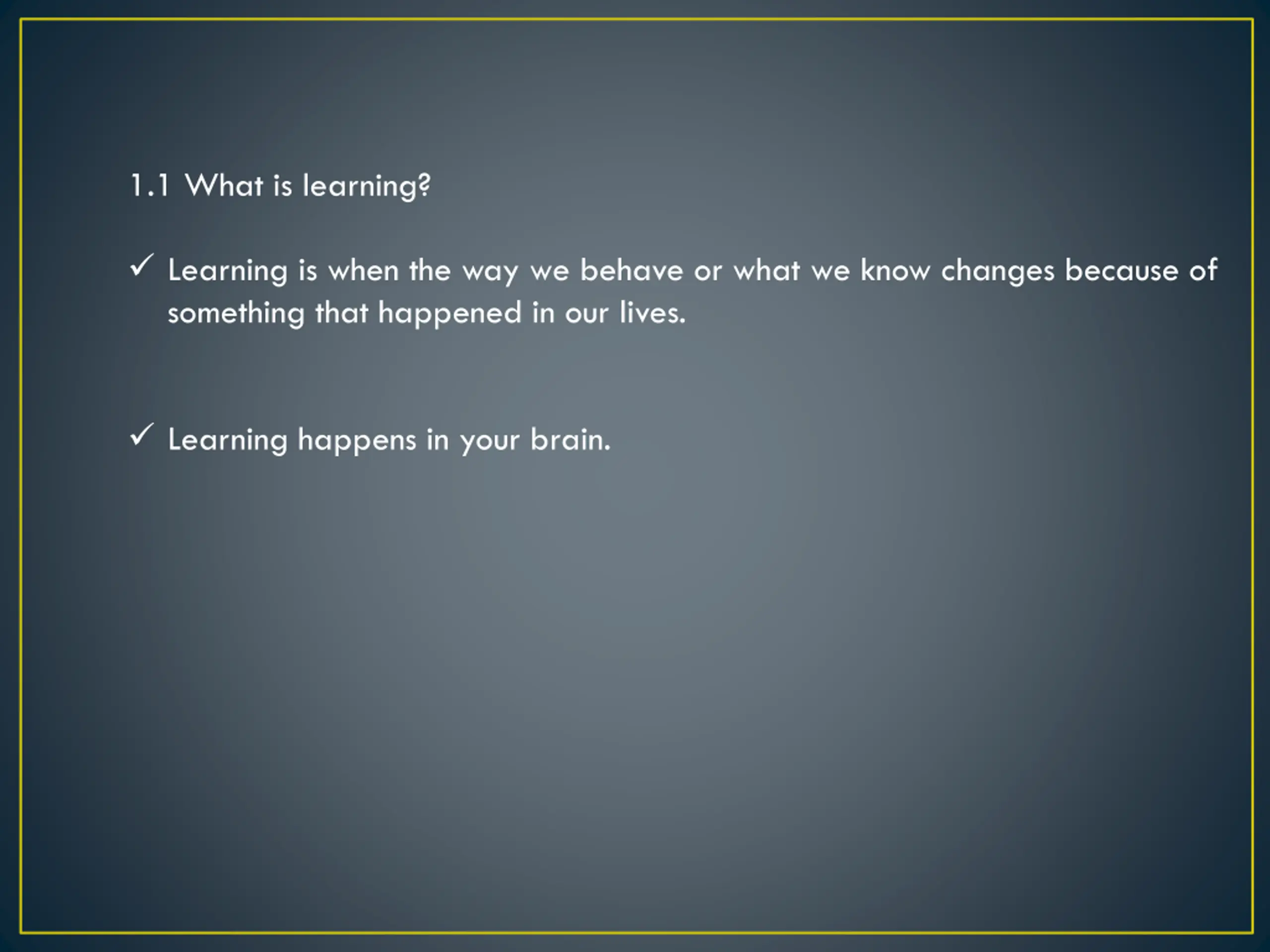 - 1.1 What is learning? Learning is when the way we behave or what we know changes because of something that happened in our lives. Learning happens in your brain.