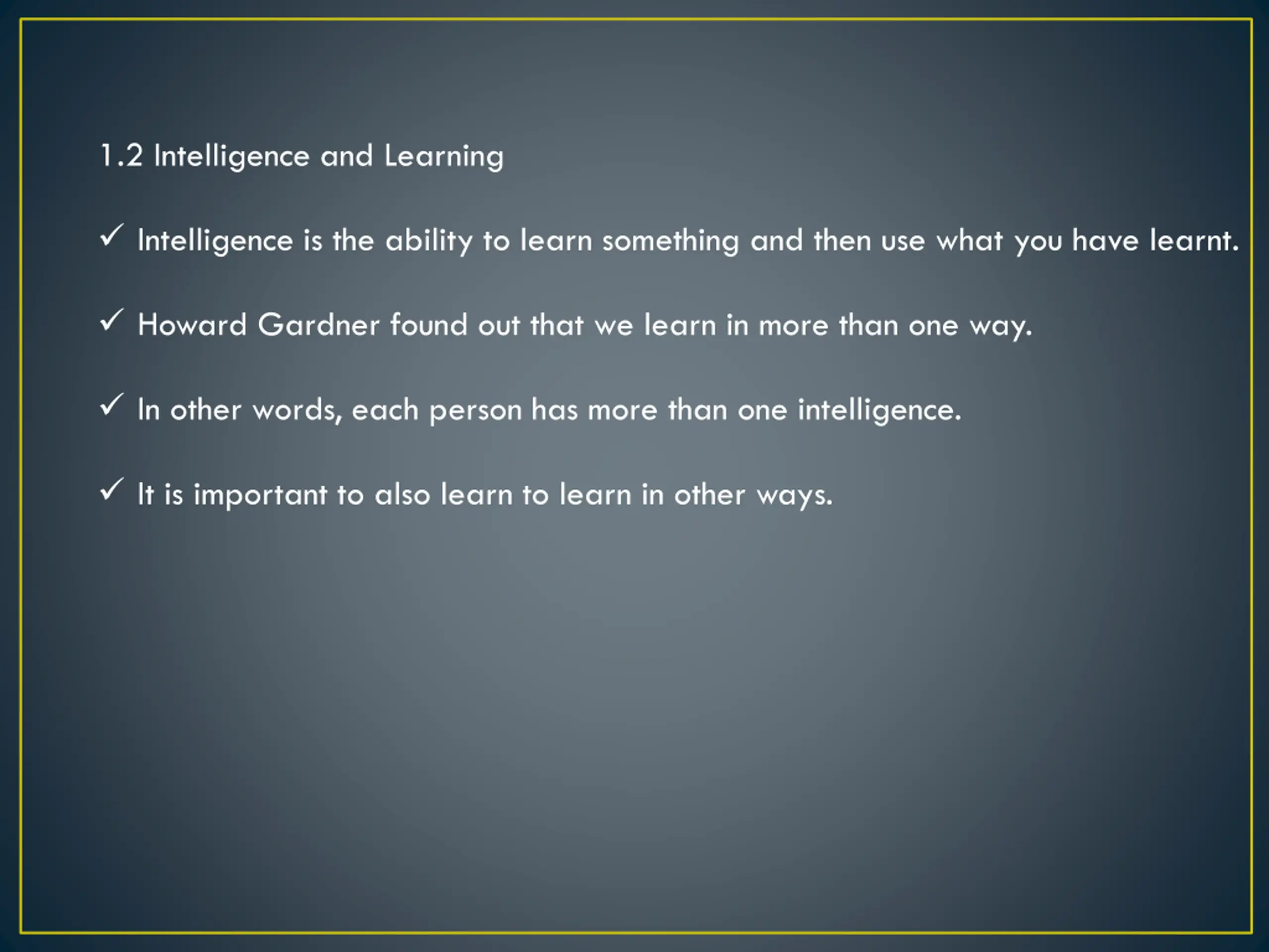 - 1.2 Intelligence and Learning Intelligence is the ability to learn something and then use what you have learnt. Howard Gardner found out that we learn in more than one way. In other words, each person has more than one intelligence. It is important to also learn to learn in other ways.