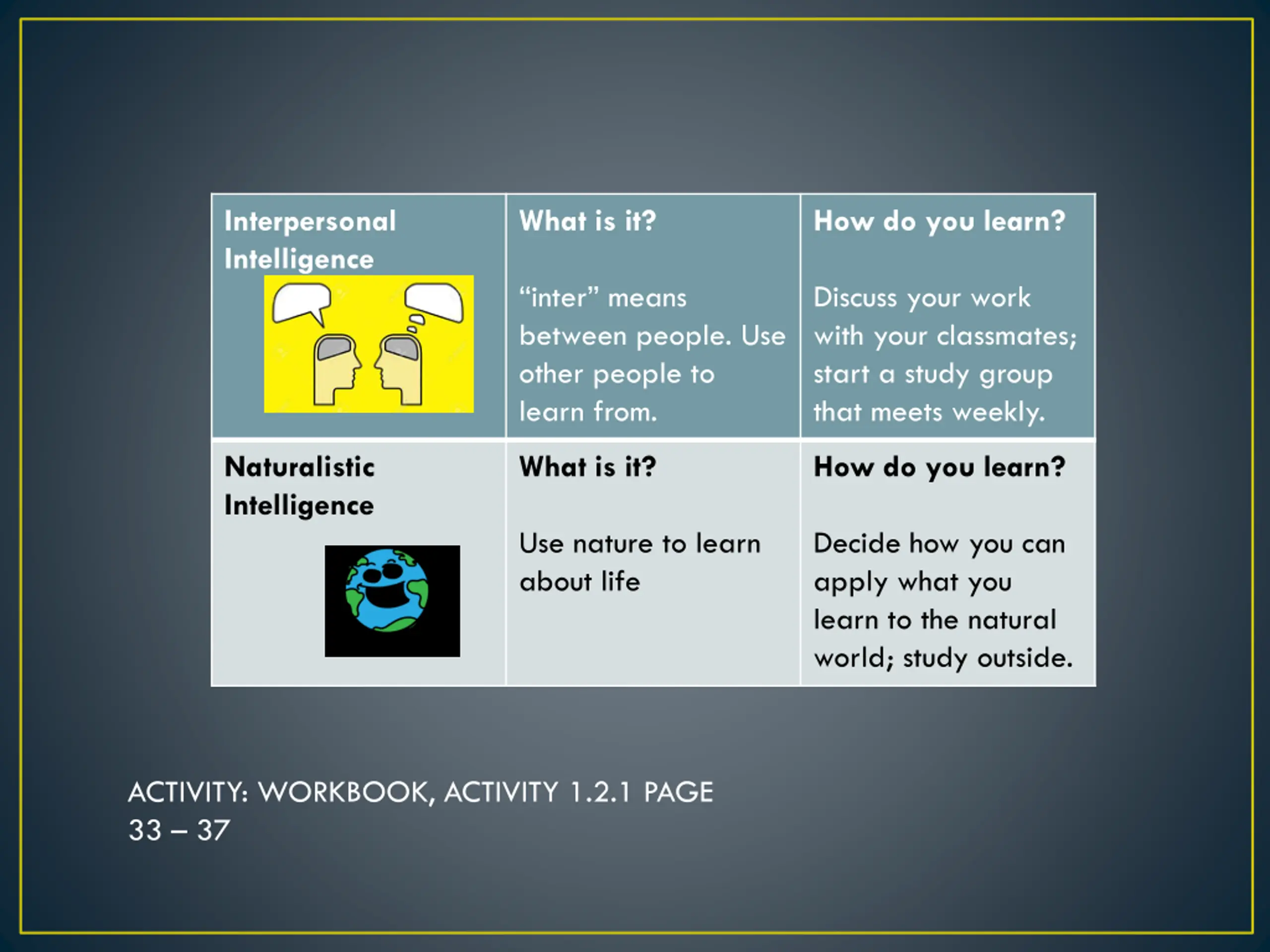 - Interpersonal Intelligence What is it? How do you learn? inter means between people. Use other people to learn from. Discuss your work with your classmates; start a study group that meets weekly. Naturalistic Intelligence What is it? How do you learn? Use nature to learn about life Decide how you can apply what you learn to the natural world; study outside. ACTIVITY: WORKBOOK, ACTIVITY 1.2.1 PAGE 33 37