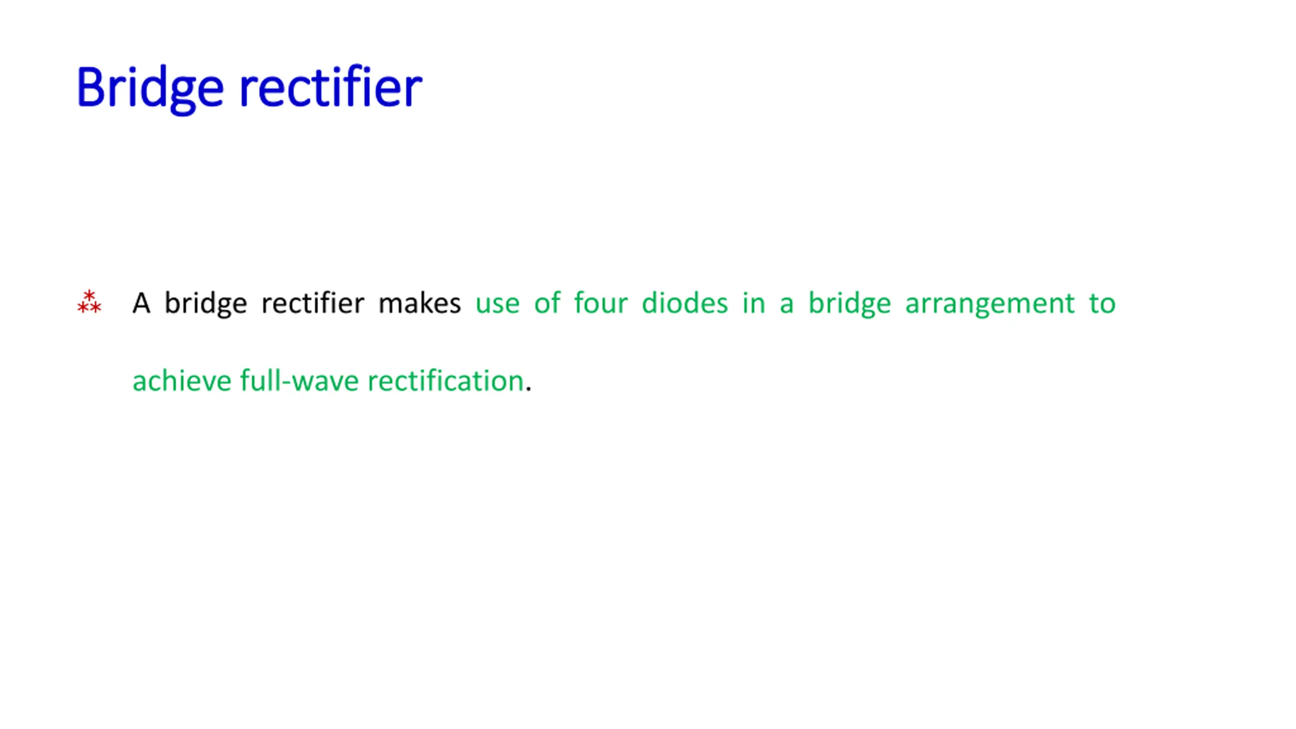 Bridge rectifier Bridge rectifier A bridge rectifier makes use of four diodes in a bridge arrangement to achieve full-wave rectification.