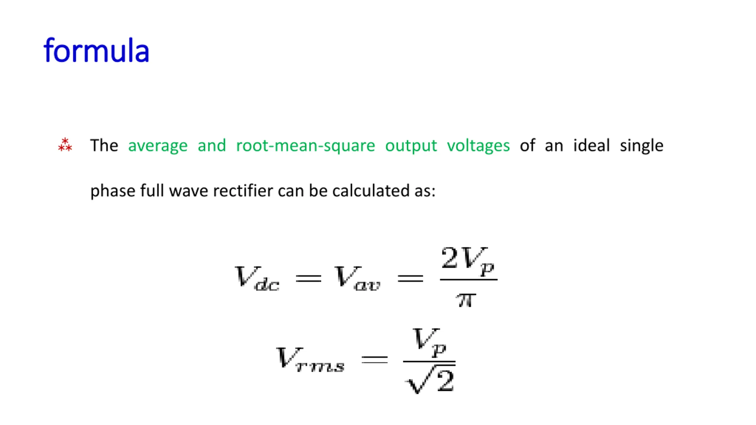 formula formula The average and root-mean-square output voltages of an ideal single phase full wave rectifier can be calculated as: