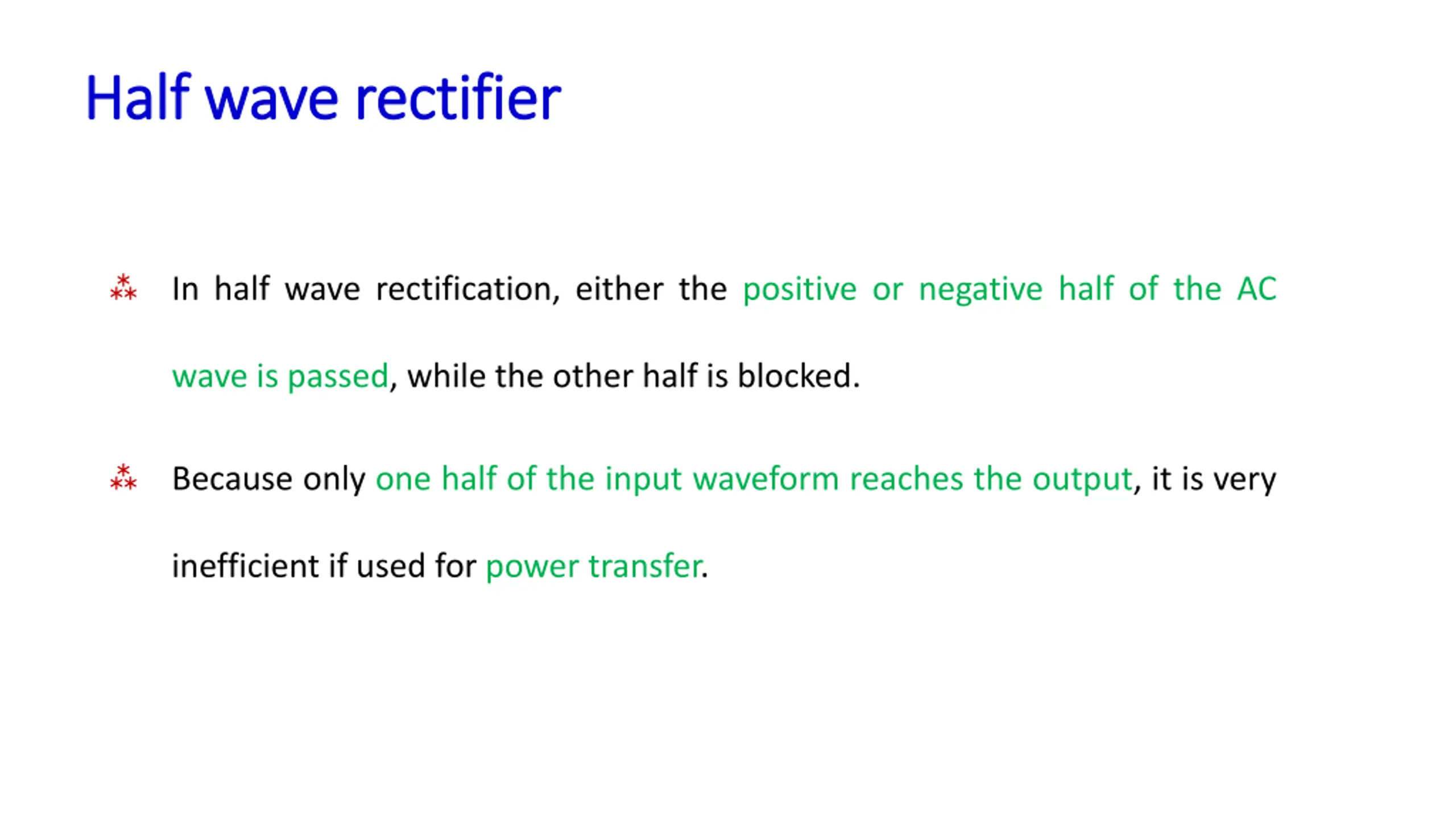 Half wave rectifier Half wave rectifier In half wave rectification, either the positive or negative half of the AC wave is passed, while the other half is blocked. Because only one half of the input waveform reaches the output, it is very inefficient if used for power transfer.