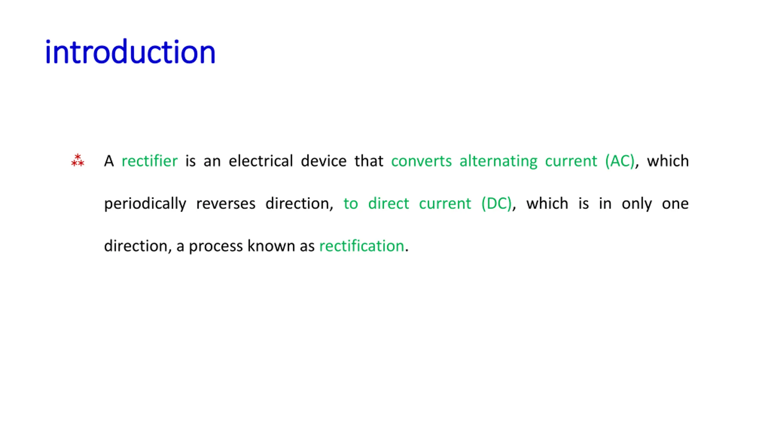 introduction introduction A rectifier is an electrical device that converts alternating current (AC), which periodically reverses direction, to direct current (DC), which is in only one direction, a process known as rectification.