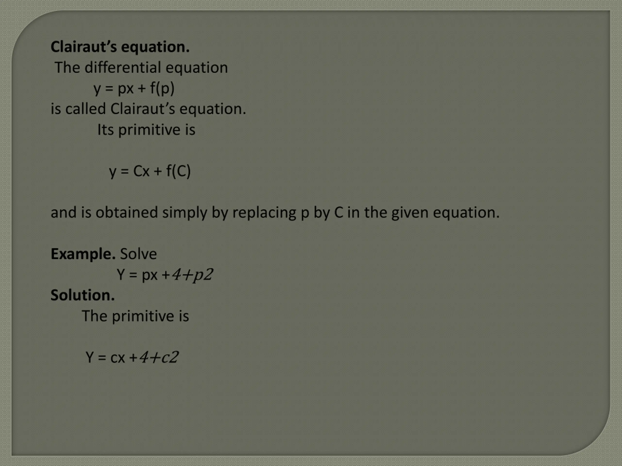 Clairauts equation. The differential equation y = px + f(p) is called Clairaut s equation. Its primitive is y = Cx + f(C) and is obtained simply by replacing p by C in the given equation. Example. Solve Y = px +4+p2 Solution. The primitive is Y = cx +4+c2