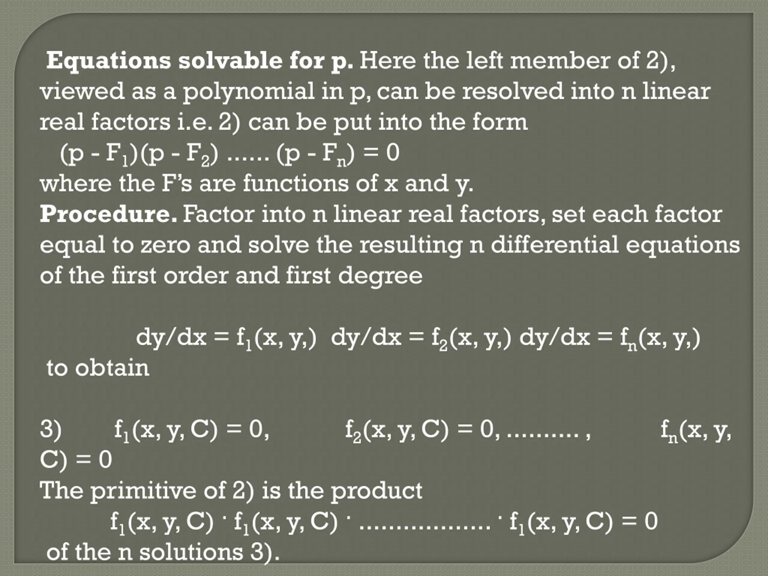 Equations solvable for p.Here the left member of 2), viewed as a polynomial in p, can be resolved into n linear real factors i.e. 2) can be put into the form (p - F1)(p - F2) ...... (p - Fn) = 0 where the F s are functions of x and y. Procedure.Factor into n linear real factors, set each factor equal to zero and solve the resulting n differential equations of the first order and first degree dy/dx = f1(x, y,) dy/dx = f2(x, y,) dy/dx = fn(x, y,) to obtain 3) C) = 0 The primitive of 2) is the product f1(x, y, C) f1(x, y, C) .................. f1(x, y, C) = 0 of the n solutions 3). f1(x, y, C) = 0, f2(x, y, C) = 0, .......... , fn(x, y,