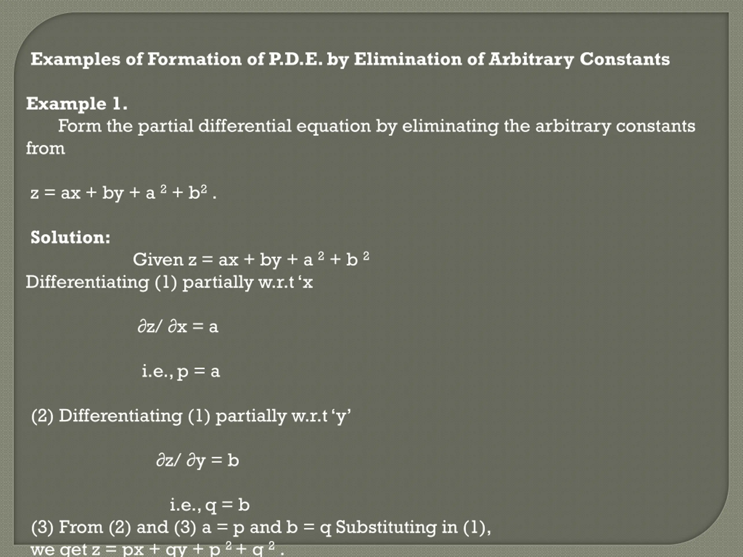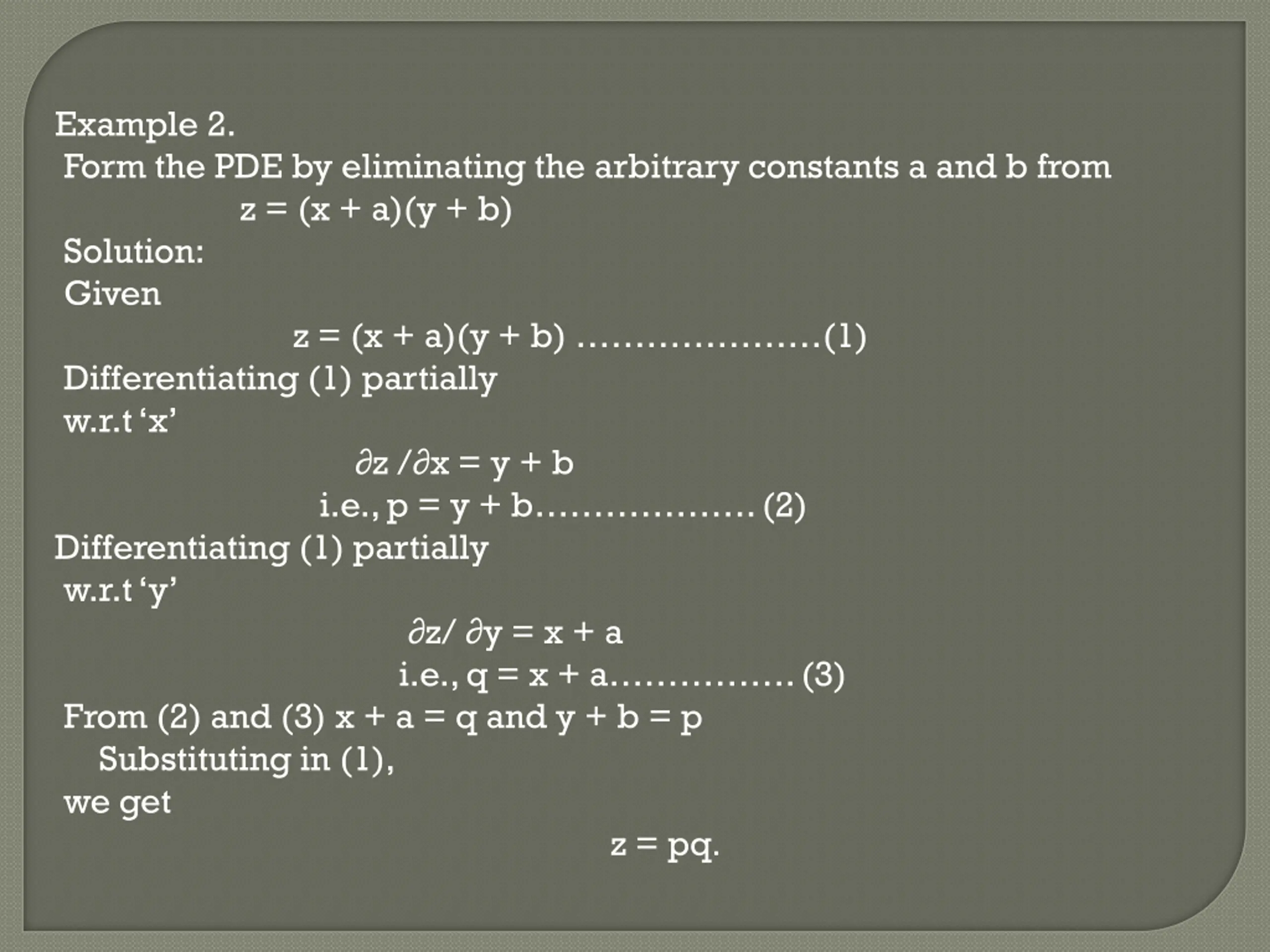 Example 2. Form the PDE by eliminating the arbitrary constants a and b from z = (x + a)(y + b) Solution: Given z = (x + a)(y + b) (1) Differentiating (1) partially w.r.t x z / x = y + b i.e., p = y + b . (2) Differentiating (1) partially w.r.t y z/ y = x + a i.e., q = x + a . (3) From (2) and (3) x + a = q and y + b = p Substituting in (1), we get z = pq.