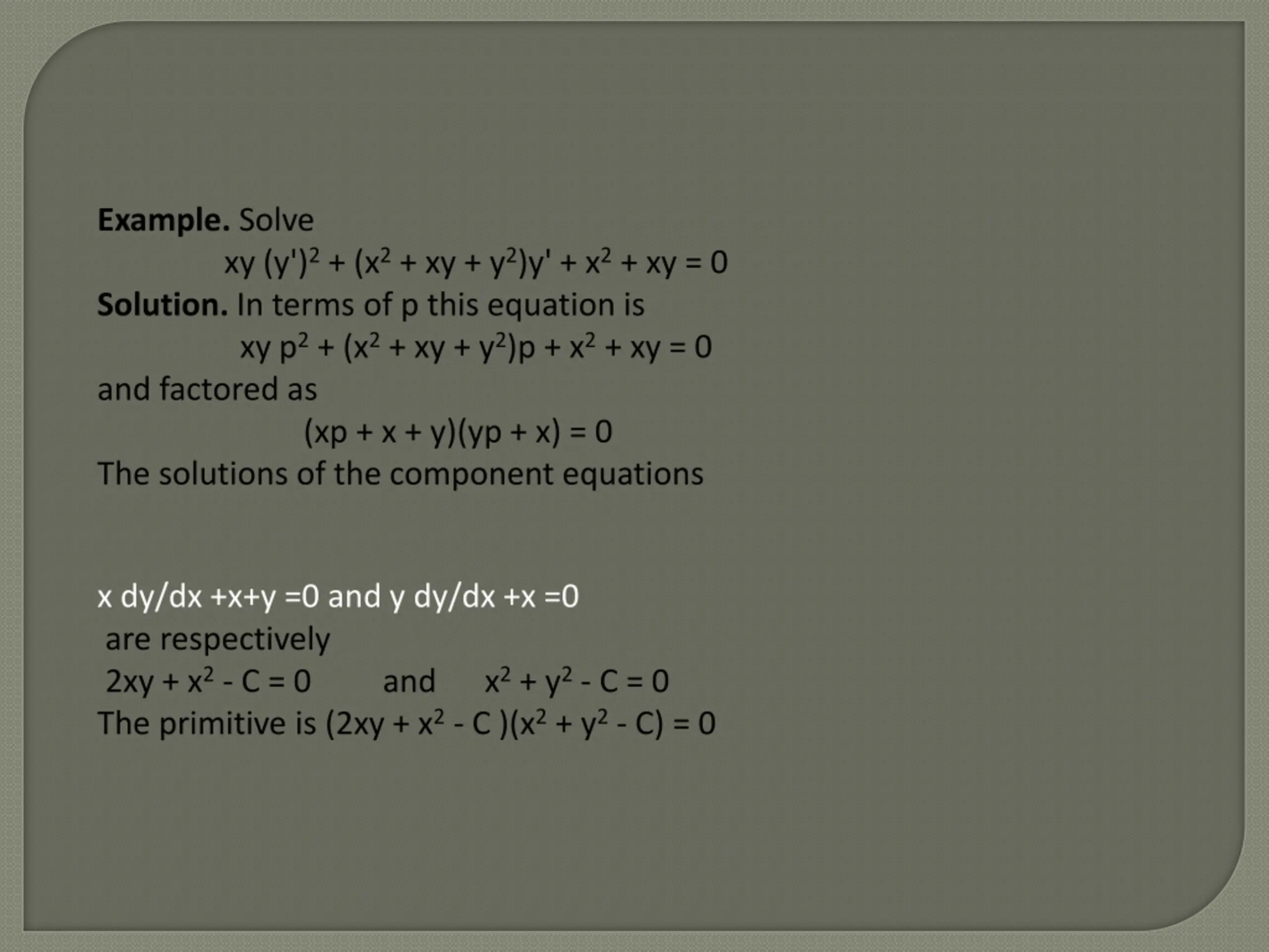 Example. Solve xy (y')2+ (x2+ xy + y2)y' + x2+ xy = 0 Solution. In terms of p this equation is xy p2+ (x2+ xy + y2)p + x2+ xy = 0 and factored as (xp + x + y)(yp + x) = 0 The solutions of the component equations x dy/dx +x+y =0 and y dy/dx +x =0 are respectively 2xy + x2- C = 0 The primitive is (2xy + x2- C )(x2+ y2- C) = 0 x2+ y2- C = 0 and