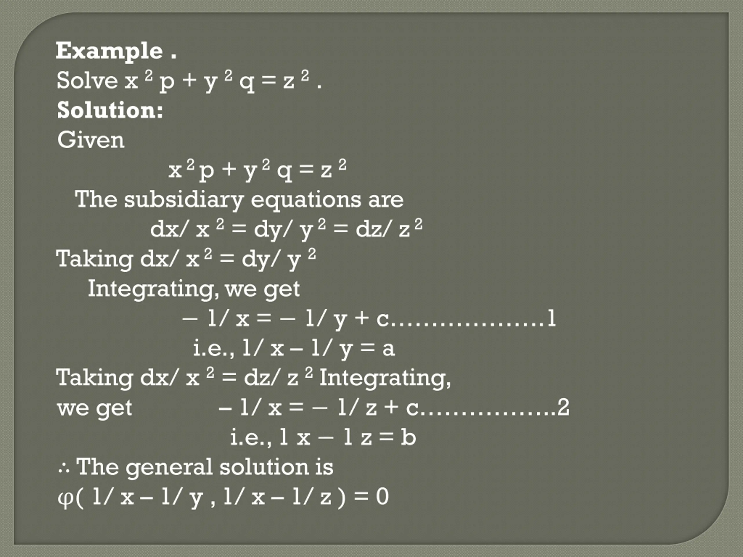 Example . Solve x 2 p + y 2 q = z 2 . Solution: Given x 2 p + y 2 q = z 2 The subsidiary equations are dx/ x 2 = dy/ y 2 = dz/ z 2 Taking dx/ x 2 = dy/ y 2 Integrating, we get 1/ x = 1/ y + c .1 i.e., 1/ x 1/ y = a Taking dx/ x 2 = dz/ z 2 Integrating, we get 1/ x = 1/ z + c ..2 i.e., 1 x 1 z = b The general solution is ( 1/ x 1/ y , 1/ x 1/ z ) = 0
