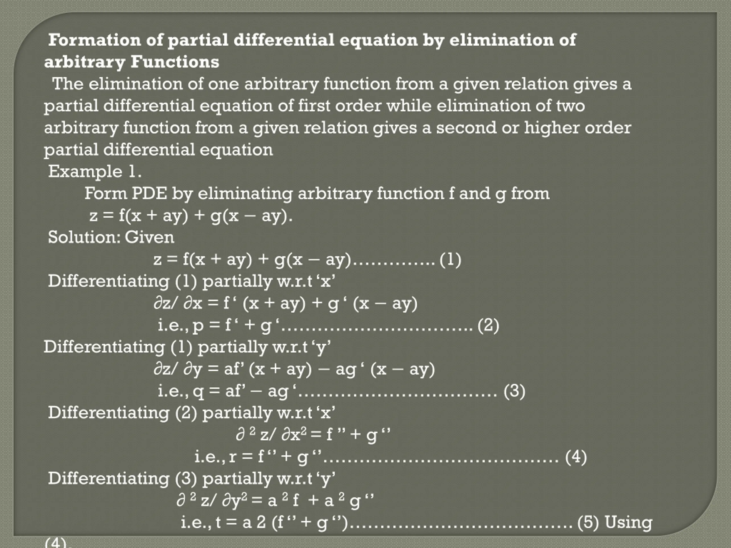 Formation of partial differential equation by elimination of arbitrary Functions The elimination of one arbitrary function from a given relation gives a partial differential equation of first order while elimination of two arbitrary function from a given relation gives a second or higher order partial differential equation Example 1. Form PDE by eliminating arbitrary function f and g from z = f(x + ay) + g(x ay). Solution: Given z = f(x + ay) + g(x ay) .. (1) Differentiating (1) partially w.r.t x z/ x = f (x + ay) + g (x ay) i.e., p = f + g .. (2) Differentiating (1) partially w.r.t y z/ y = af (x + ay) ag (x ay) i.e., q = af ag (3) Differentiating (2) partially w.r.t x 2z/ x2 = f + g i.e., r = f + g (4) Differentiating (3) partially w.r.t y 2z/ y2 = a 2 f + a 2g i.e., t = a 2 (f + g ) . (5) Using (4),