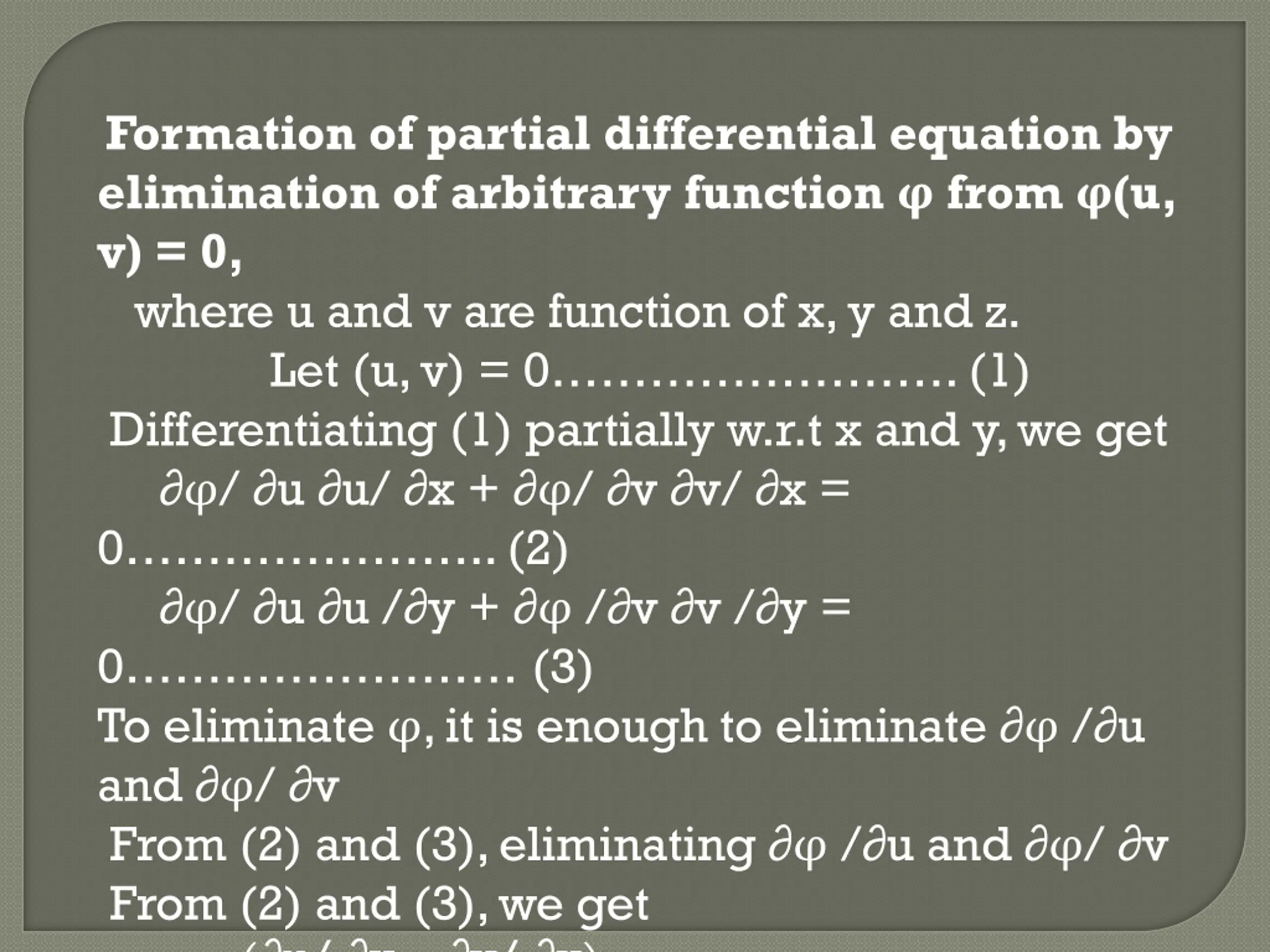 Formation of partial differential equation by elimination of arbitrary function from (u, v) = 0, where u and v are function of x, y and z. Let (u, v) = 0 . (1) Differentiating (1) partially w.r.t x and y, we get / u u/ x + / v v/ x = 0 .. (2) / u u / y + / v v / y = 0 (3) To eliminate , it is enough to eliminate / u and / v From (2) and (3), eliminating / u and / v From (2) and (3), we get u/ x v/ x