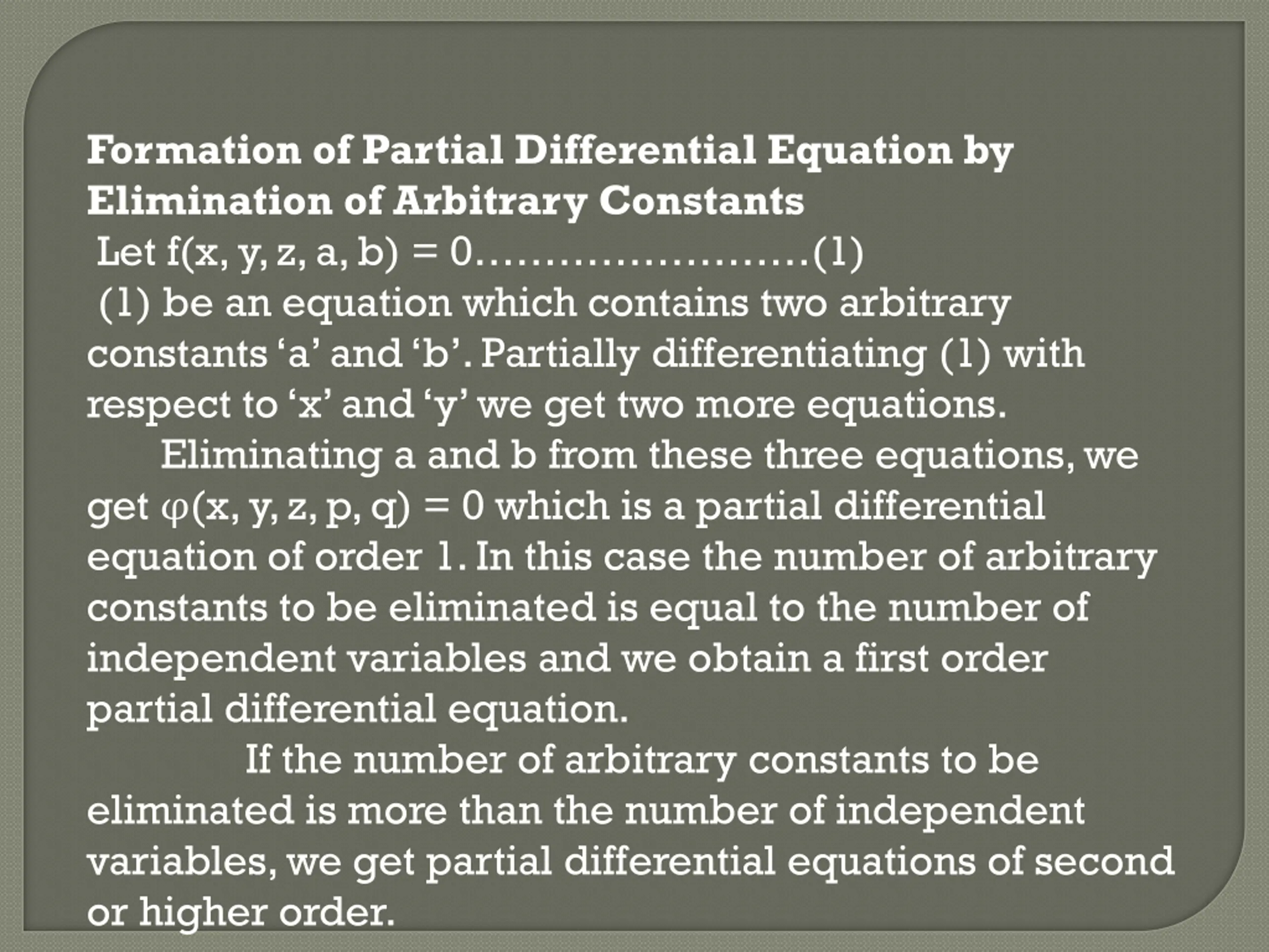 Formation of Partial Differential Equation by Elimination of Arbitrary Constants Let f(x, y, z, a, b) = 0 (1) (1) be an equation which contains two arbitrary constants a and b . Partially differentiating (1) with respect to x and y we get two more equations. Eliminating a and b from these three equations, we get (x, y, z, p, q) = 0 which is a partial differential equation of order 1. In this case the number of arbitrary constants to be eliminated is equal to the number of independent variables and we obtain a first order partial differential equation. If the number of arbitrary constants to be eliminated is more than the number of independent variables, we get partial differential equations of second or higher order.