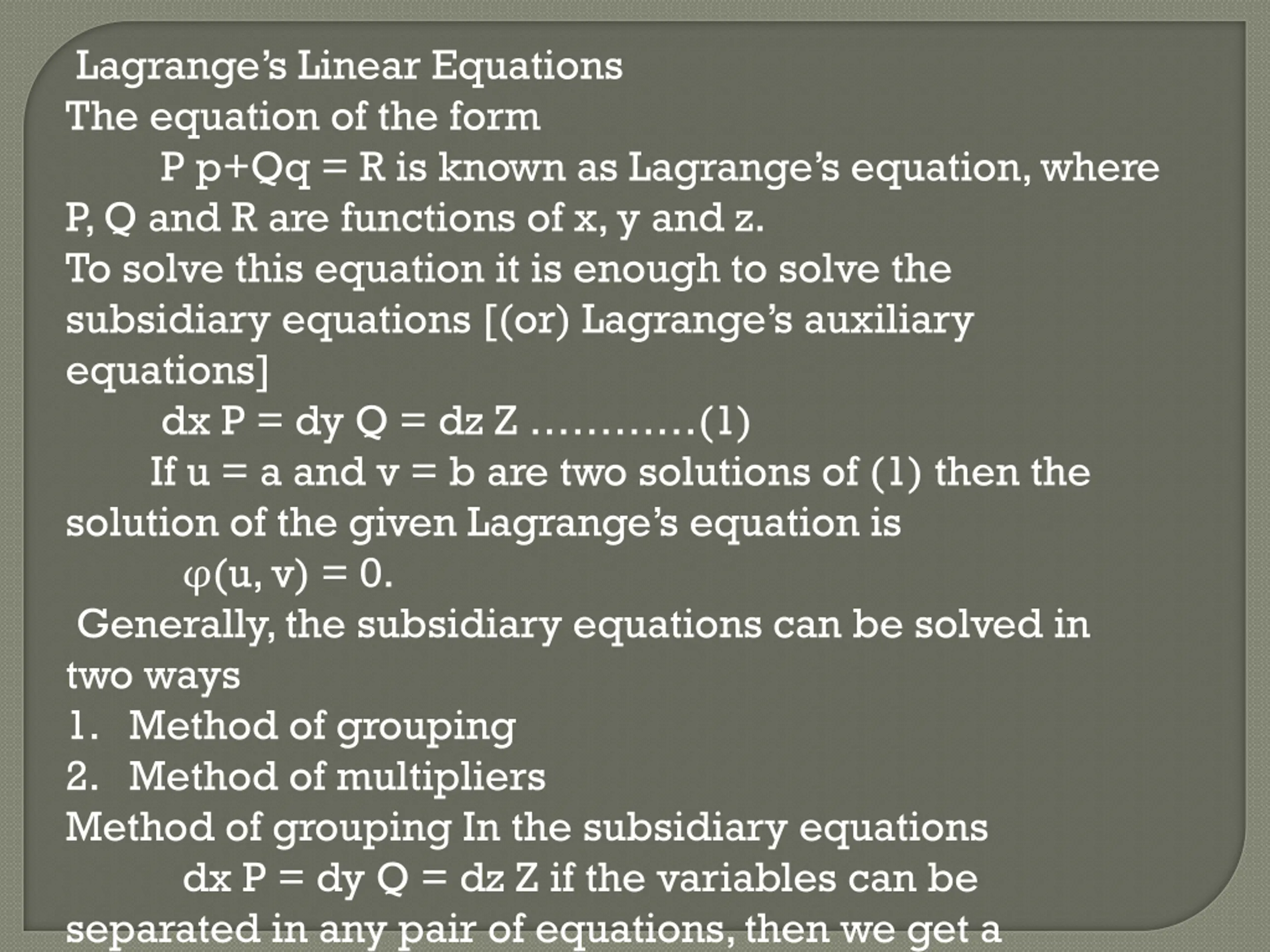 Lagranges Linear Equations The equation of the form P p+Qq = R is known as Lagrange s equation, where P, Q and R are functions of x, y and z. To solve this equation it is enough to solve the subsidiary equations [(or) Lagrange s auxiliary equations] dx P = dy Q = dz Z (1) If u = a and v = b are two solutions of (1) then the solution of the given Lagrange s equation is (u, v) = 0. Generally, the subsidiary equations can be solved in two ways 1. Method of grouping 2. Method of multipliers Method of grouping In the subsidiary equations dx P = dy Q = dz Z if the variables can be separated in any pair of equations, then we get a