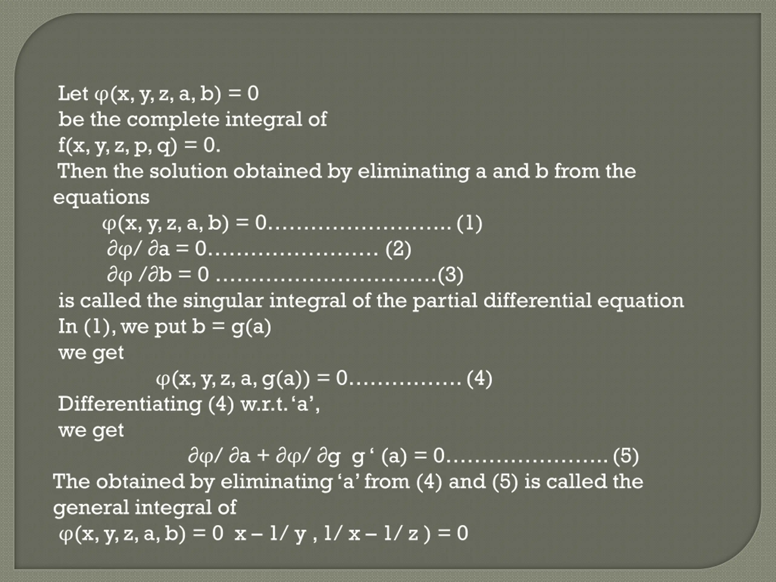 Let (x, y, z, a, b) = 0 be the complete integral of f(x, y, z, p, q) = 0. Then the solution obtained by eliminating a and b from the equations (x, y, z, a, b) = 0 .. (1) / a = 0 (2) / b = 0 .(3) is called the singular integral of the partial differential equation In (1), we put b = g(a) we get (x, y, z, a, g(a)) = 0 . (4) Differentiating (4) w.r.t. a , we get / a + / g g (a) = 0 .. (5) The obtained by eliminating a from (4) and (5) is called the general integral of (x, y, z, a, b) = 0 x 1/ y , 1/ x 1/ z ) = 0