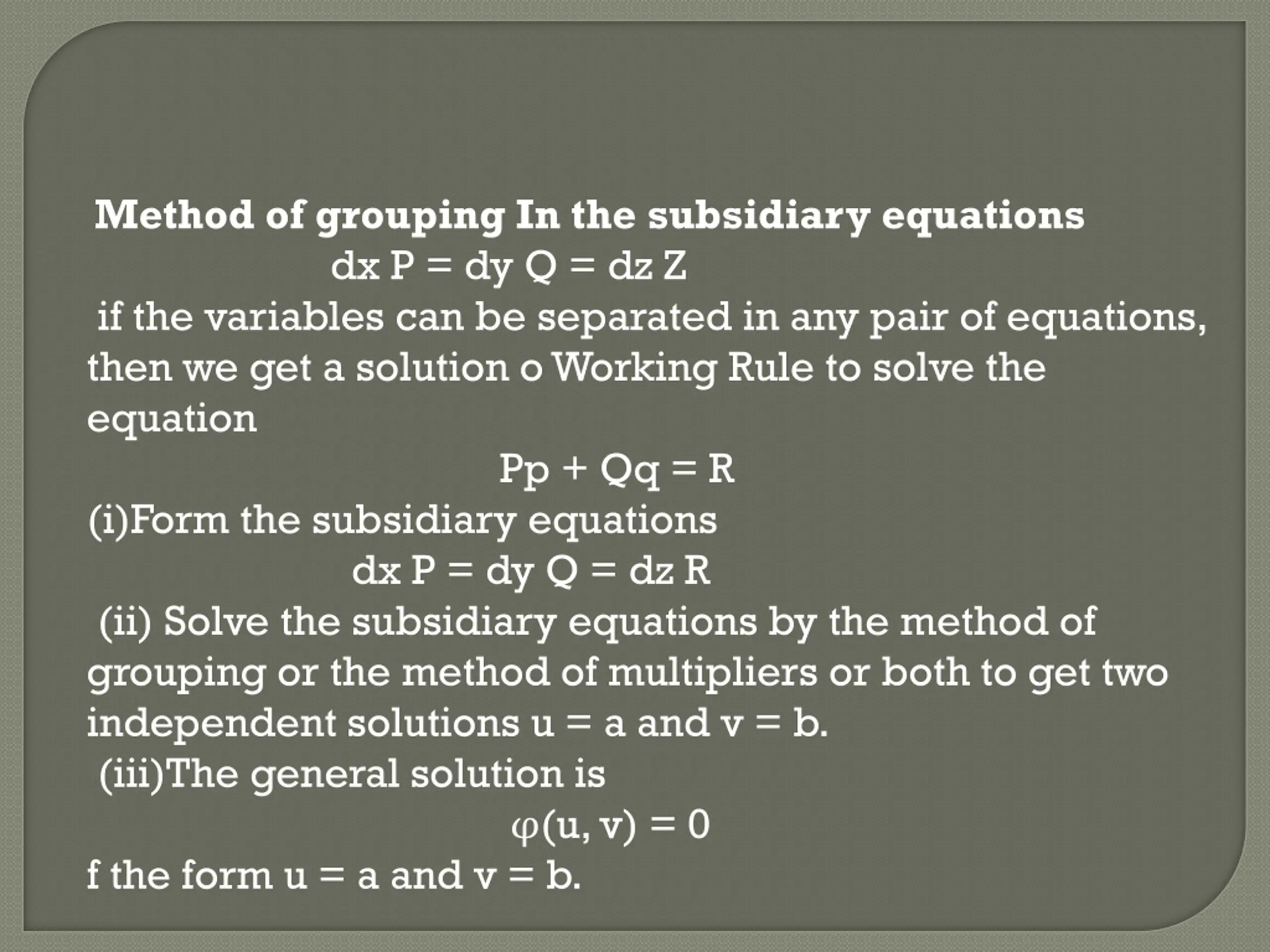 Method of grouping In the subsidiary equations dx P = dy Q = dz Z if the variables can be separated in any pair of equations, then we get a solution o Working Rule to solve the equation Pp + Qq = R (i)Form the subsidiary equations dx P = dy Q = dz R (ii) Solve the subsidiary equations by the method of grouping or the method of multipliers or both to get two independent solutions u = a and v = b. (iii)The general solution is (u, v) = 0 f the form u = a and v = b.