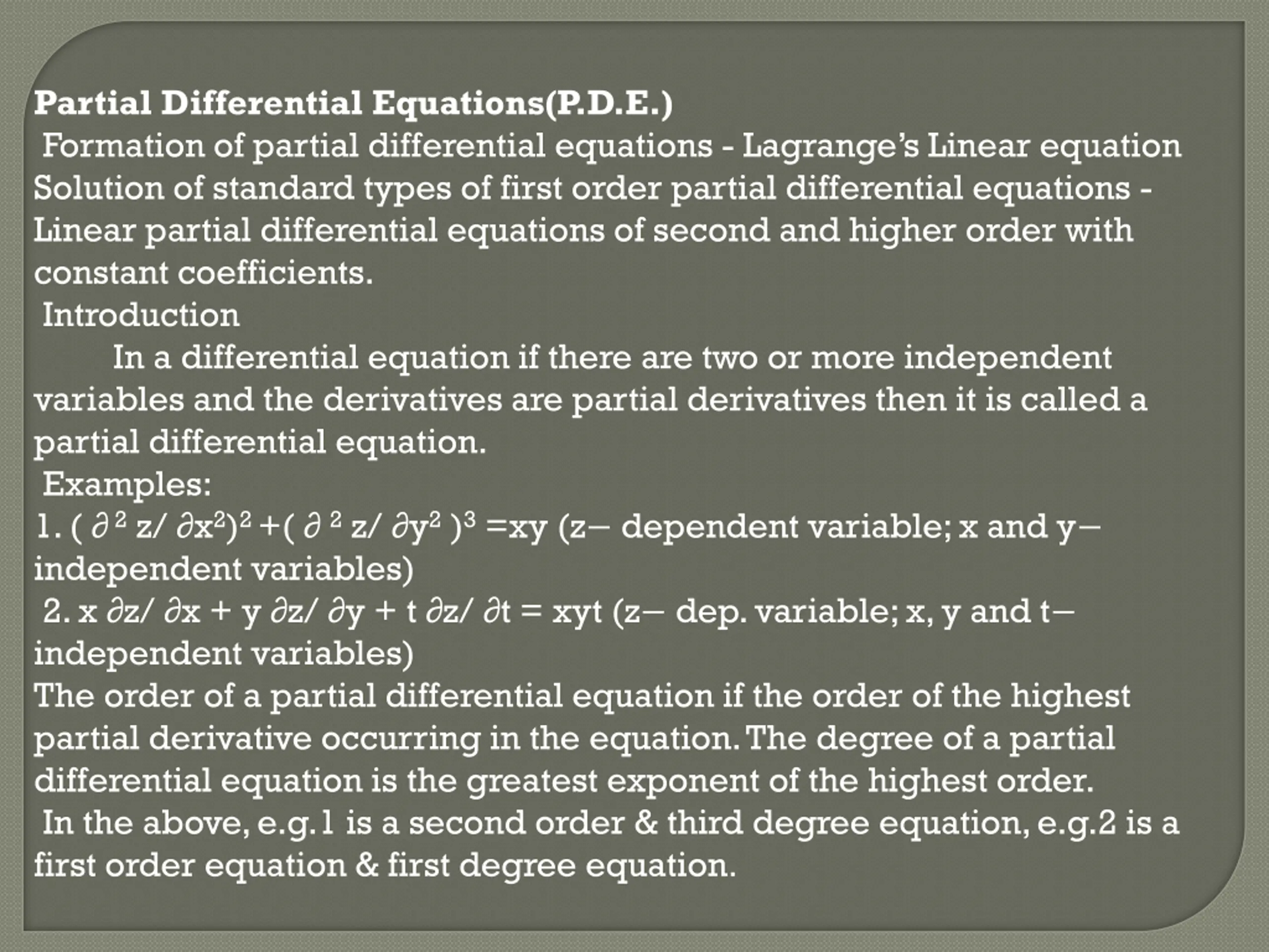 Partial Differential Equations(P.D.E.) Formation of partial differential equations - Lagrange s Linear equation Solution of standard types of first order partial differential equations - Linear partial differential equations of second and higher order with constant coefficients. Introduction In a differential equation if there are two or more independent variables and the derivatives are partial derivatives then it is called a partial differential equation. Examples: 1. ( 2z/ x2)2 +( 2z/ y2 )3 =xy (z dependent variable; x and y independent variables) 2. x z/ x + y z/ y + t z/ t = xyt (z dep. variable; x, y and t independent variables) The order of a partial differential equation if the order of the highest partial derivative occurring in the equation. The degree of a partial differential equation is the greatest exponent of the highest order. In the above, e.g.1 is a second order & third degree equation, e.g.2 is a first order equation & first degree equation.