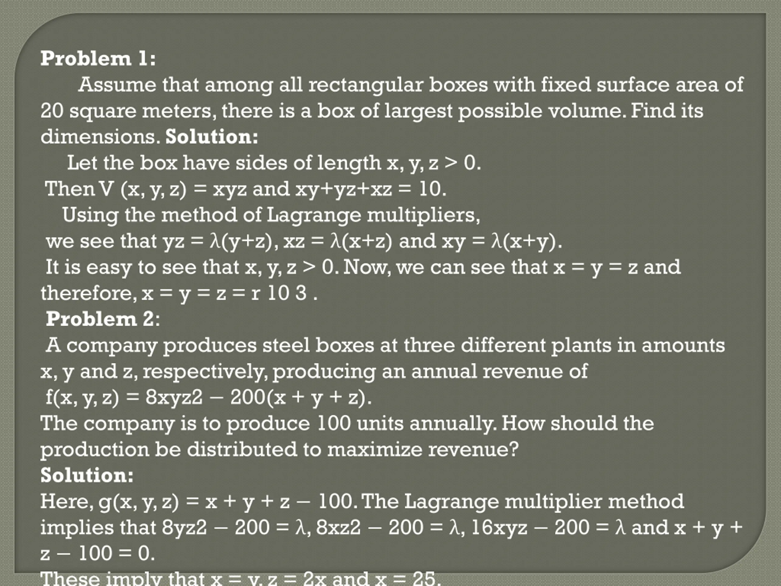 Problem 1: Assume that among all rectangular boxes with fixed surface area of 20 square meters, there is a box of largest possible volume. Find its dimensions. Solution: Let the box have sides of length x, y, z > 0. Then V (x, y, z) = xyz and xy+yz+xz = 10. Using the method of Lagrange multipliers, we see that yz = (y+z), xz = (x+z) and xy = (x+y). It is easy to see that x, y, z > 0. Now, we can see that x = y = z and therefore, x = y = z = r 10 3 . Problem 2: A company produces steel boxes at three different plants in amounts x, y and z, respectively, producing an annual revenue of f(x, y, z) = 8xyz2 200(x + y + z). The company is to produce 100 units annually. How should the production be distributed to maximize revenue? Solution: Here, g(x, y, z) = x + y + z 100. The Lagrange multiplier method implies that 8yz2 200 = , 8xz2 200 = , 16xyz 200 = and x + y + z 100 = 0. These imply that x = y, z = 2x and x = 25.