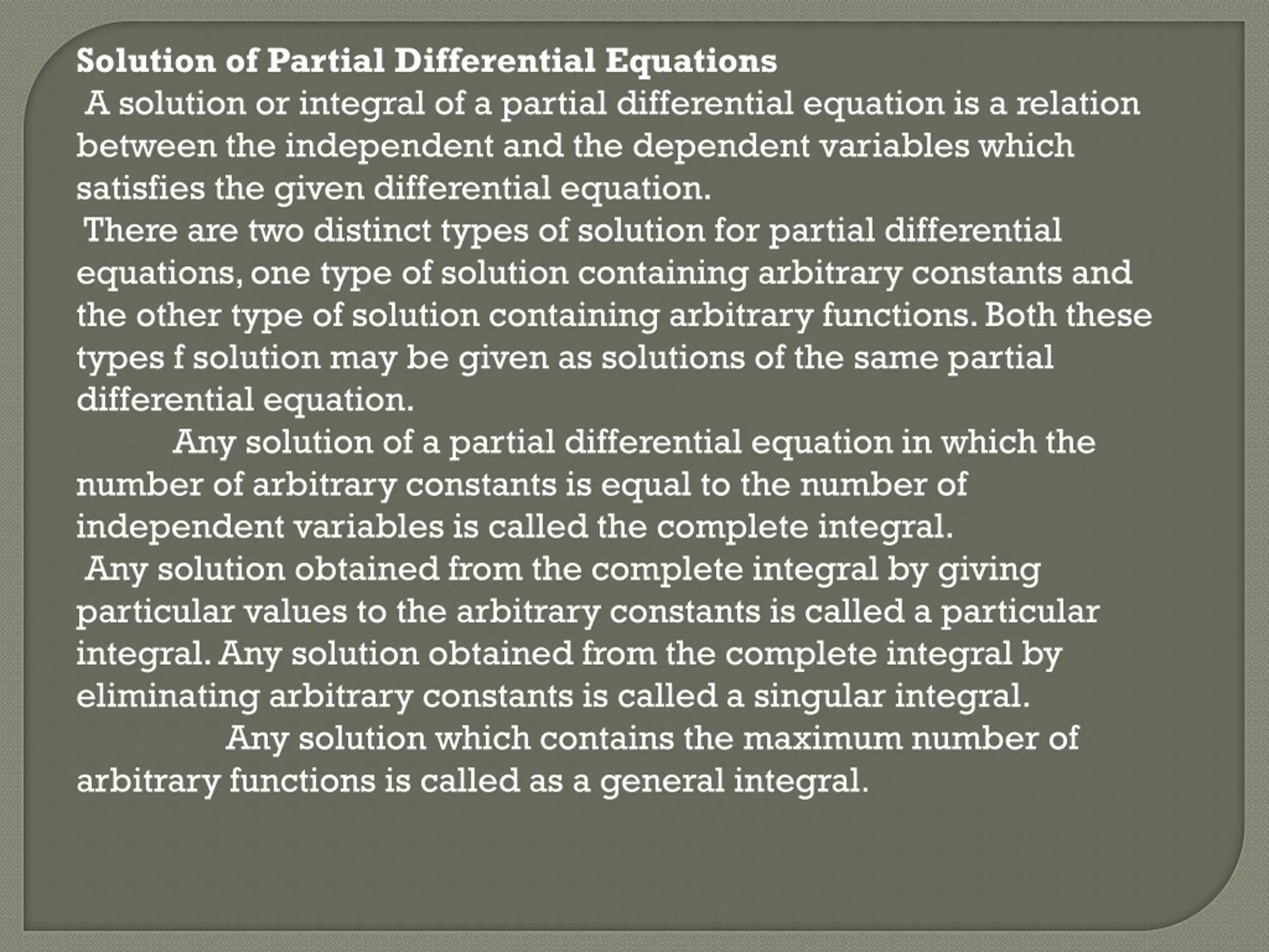 Solution of Partial Differential Equations A solution or integral of a partial differential equation is a relation between the independent and the dependent variables which satisfies the given differential equation. There are two distinct types of solution for partial differential equations, one type of solution containing arbitrary constants and the other type of solution containing arbitrary functions. Both these types f solution may be given as solutions of the same partial differential equation. Any solution of a partial differential equation in which the number of arbitrary constants is equal to the number of independent variables is called the complete integral. Any solution obtained from the complete integral by giving particular values to the arbitrary constants is called a particular integral. Any solution obtained from the complete integral by eliminating arbitrary constants is called a singular integral. Any solution which contains the maximum number of arbitrary functions is called as a general integral.