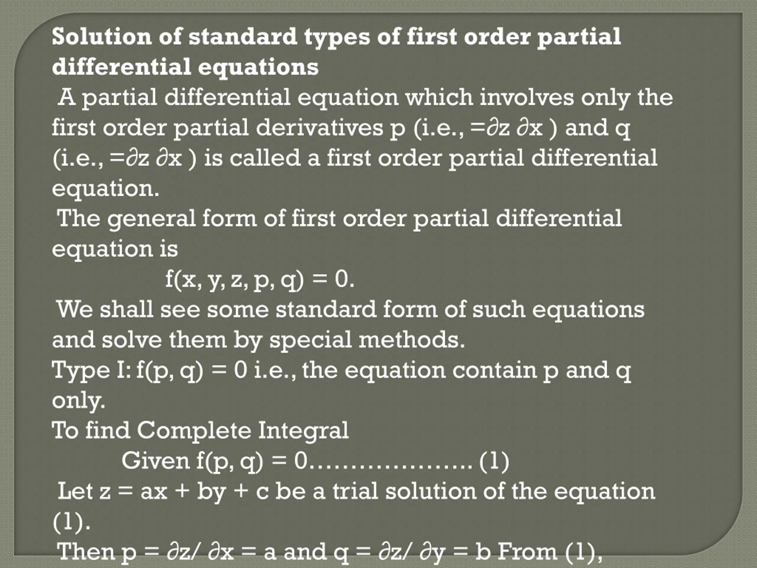 Solution of standard types of first order partial differential equations A partial differential equation which involves only the first order partial derivatives p (i.e., = z x ) and q (i.e., = z x ) is called a first order partial differential equation. The general form of first order partial differential equation is f(x, y, z, p, q) = 0. We shall see some standard form of such equations and solve them by special methods. Type I: f(p, q) = 0 i.e., the equation contain p and q only. To find Complete Integral Given f(p, q) = 0 .. (1) Let z = ax + by + c be a trial solution of the equation (1). Then p = z/ x = a and q = z/ y = b From (1),