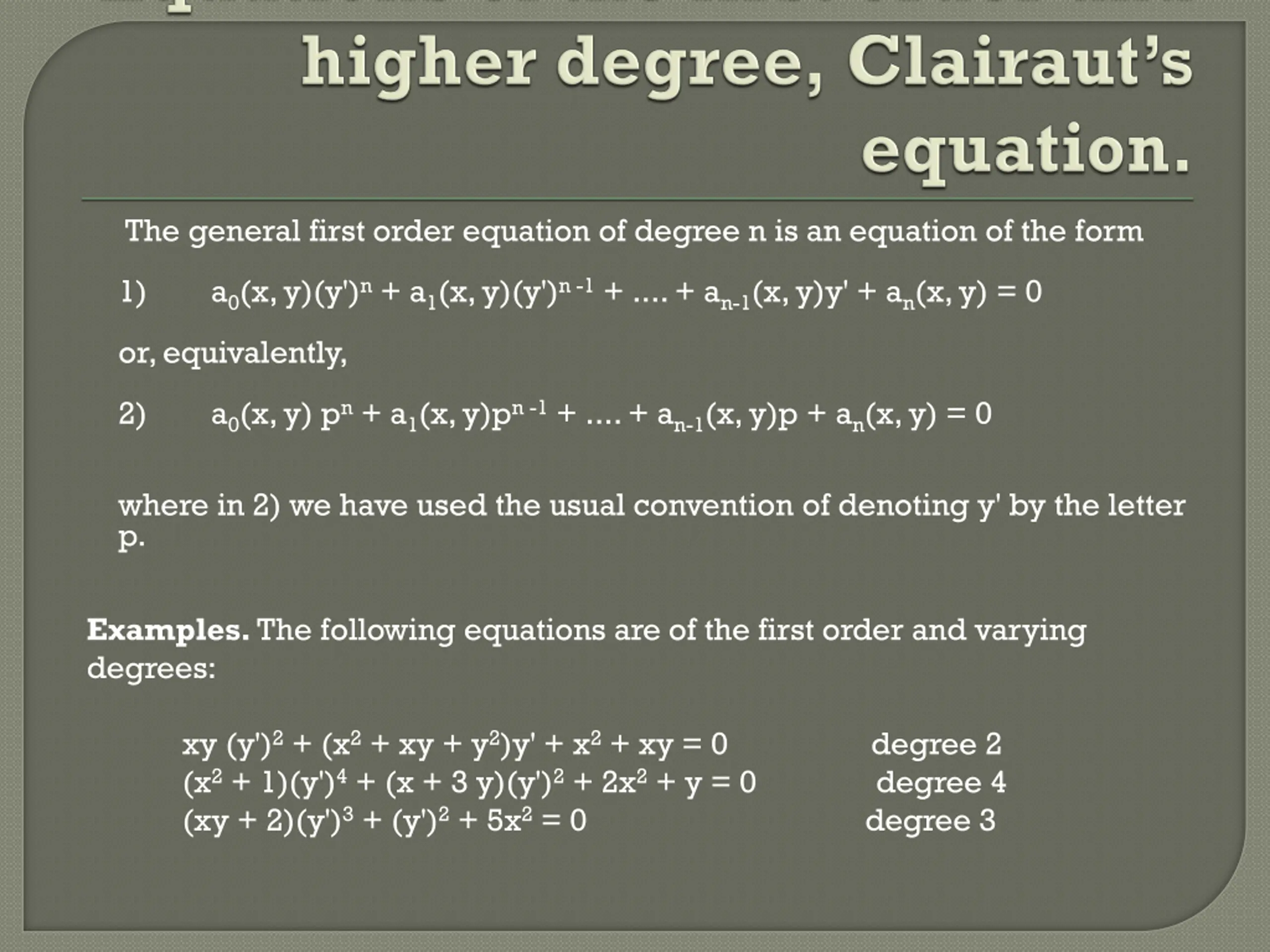 The general first order equation of degree n is an equation of the form 1) a0(x, y)(y')n+ a1(x, y)(y')n -1+ .... + an-1(x, y)y' + an(x, y) = 0 or, equivalently, 2) a0(x, y) pn+ a1(x, y)pn -1+ .... + an-1(x, y)p + an(x, y) = 0 where in 2) we have used the usual convention of denoting y' by the letter p. Examples.The following equations are of the first order and varying degrees: xy (y')2+ (x2+ xy + y2)y' + x2+ xy = 0 (x2+ 1)(y')4+ (x + 3 y)(y')2+ 2x2+ y = 0 (xy + 2)(y')3+ (y')2+ 5x2= 0 degree 2 degree 4 degree 3