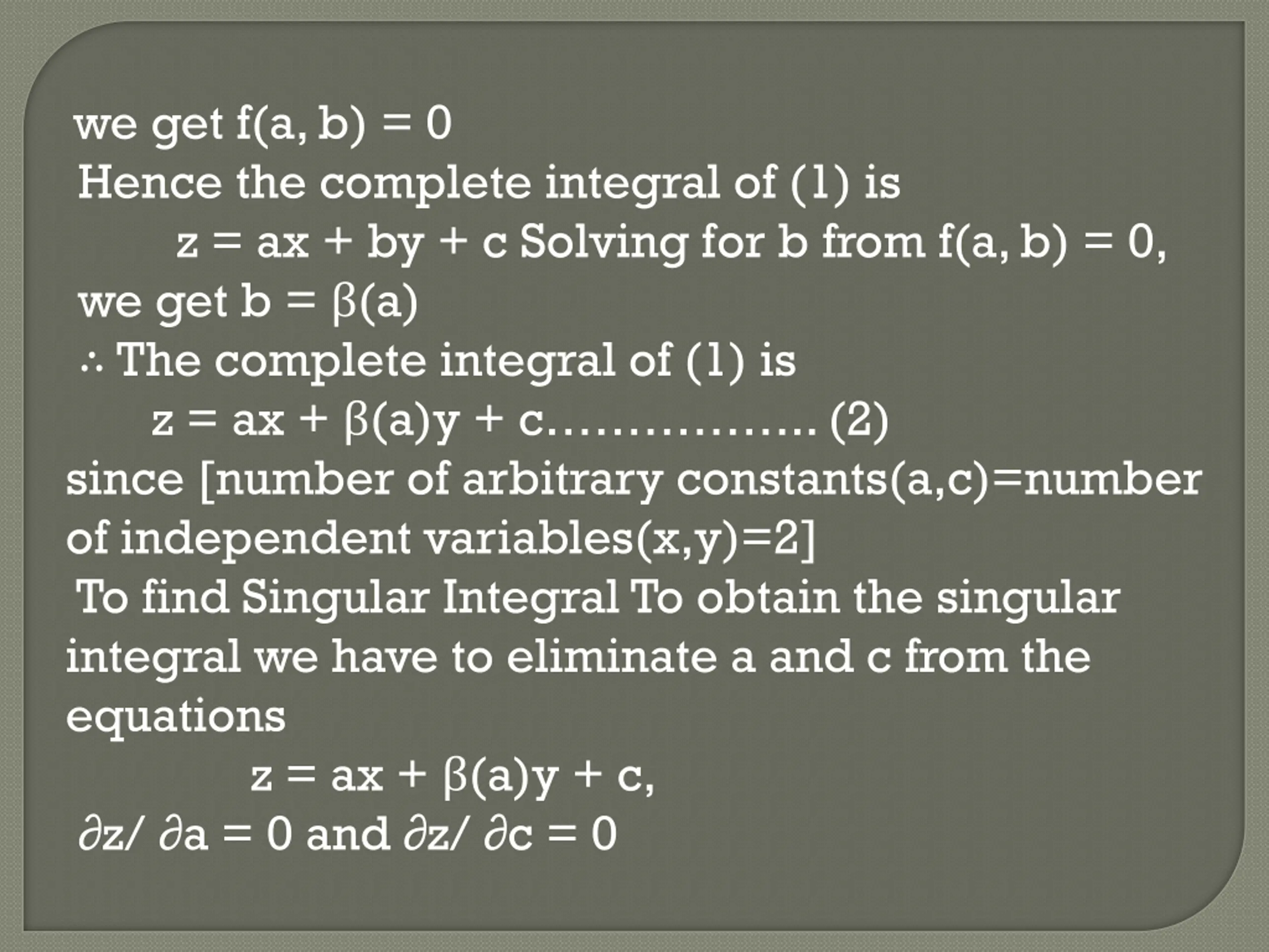 we get f(a, b) = 0 Hence the complete integral of (1) is z = ax + by + c Solving for b from f(a, b) = 0, we get b = (a) The complete integral of (1) is z = ax + (a)y + c .. (2) since [number of arbitrary constants(a,c)=number of independent variables(x,y)=2] To find Singular Integral To obtain the singular integral we have to eliminate a and c from the equations z = ax + (a)y + c, z/ a = 0 and z/ c = 0