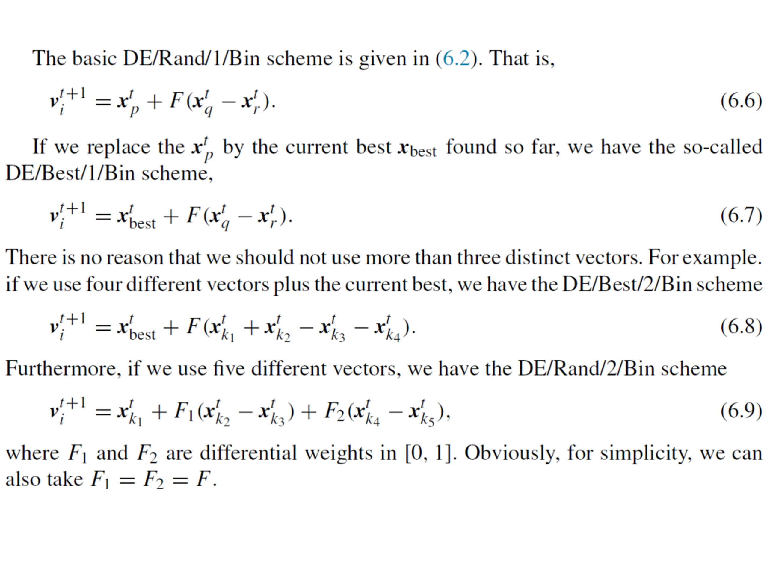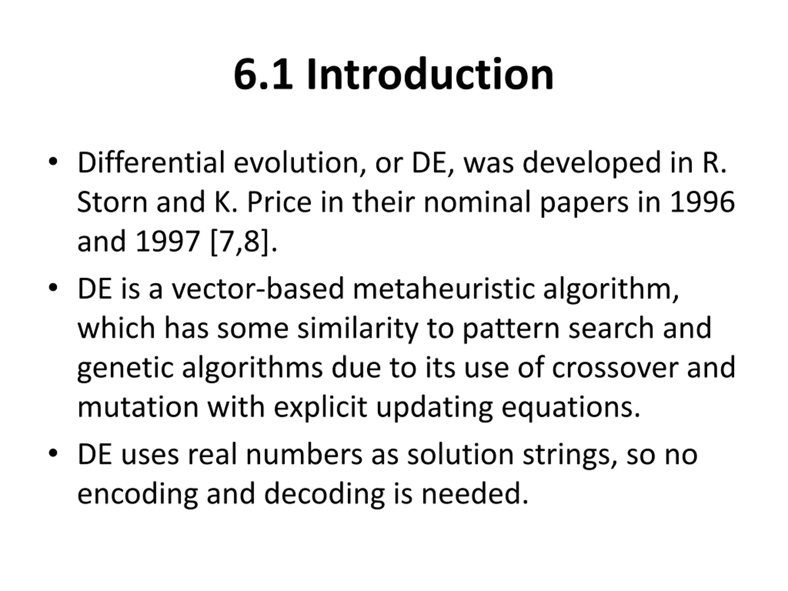6.1 Introduction Differential evolution, or DE, was developed in R. Storn and K. Price in their nominal papers in 1996 and 1997 [7,8]. DE is a vector-based metaheuristic algorithm, which has some similarity to pattern search and genetic algorithms due to its use of crossover and mutation with explicit updating equations. DE uses real numbers as solution strings, so no encoding and decoding is needed.