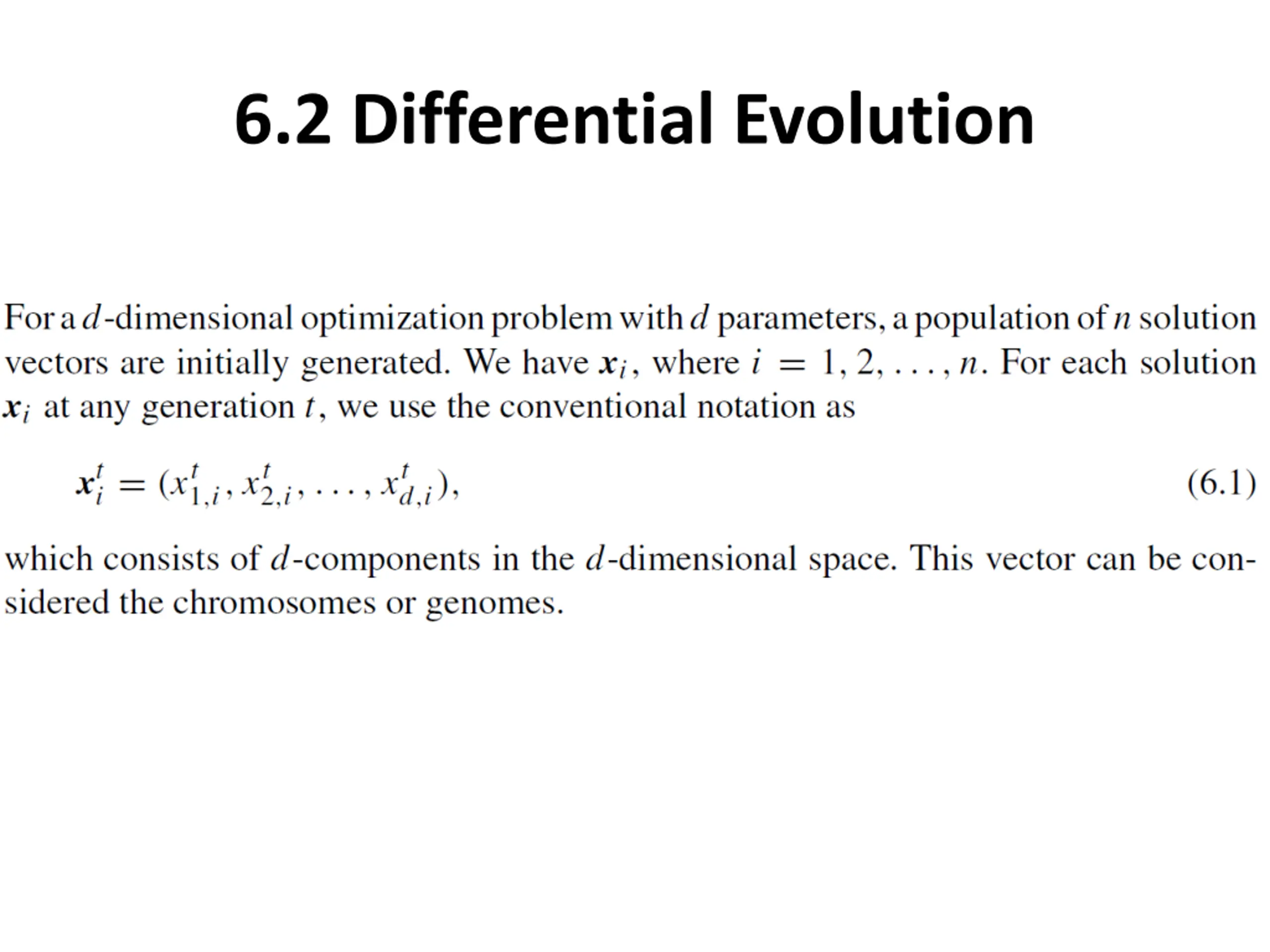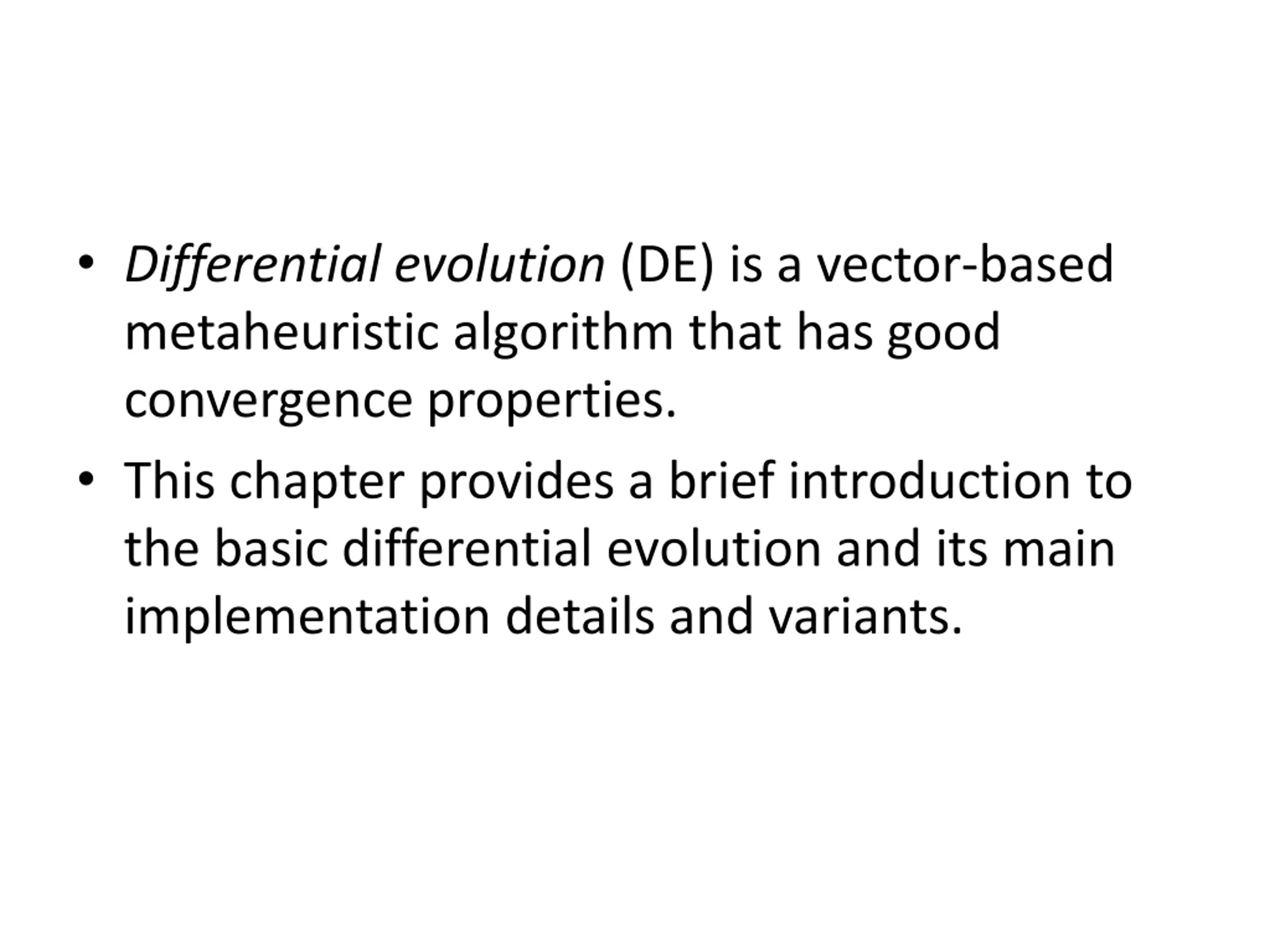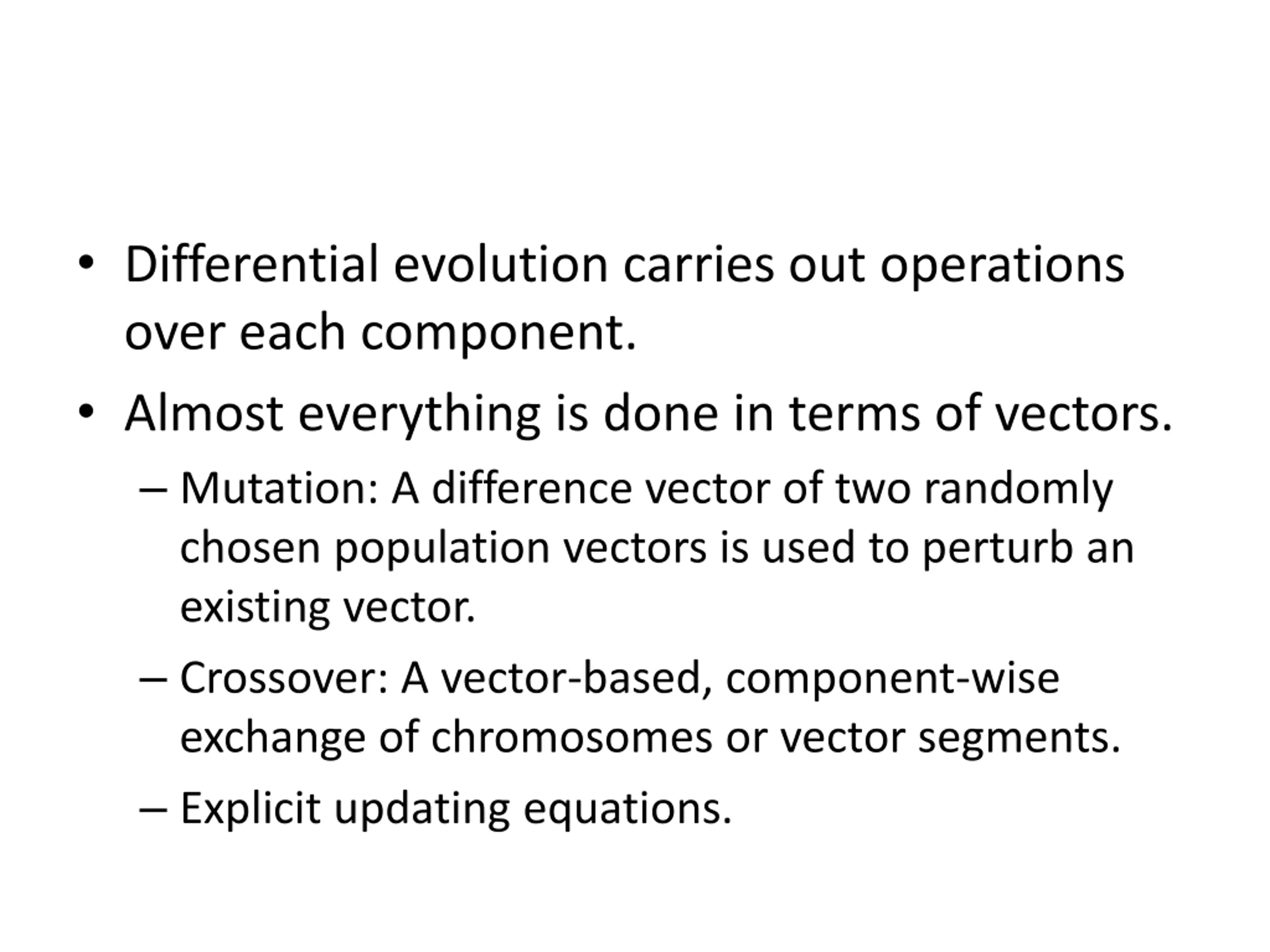 Differential evolution carries out operations over each component. Almost everything is done in terms of vectors. Mutation: A difference vector of two randomly chosen population vectors is used to perturb an existing vector. Crossover: A vector-based, component-wise exchange of chromosomes or vector segments. Explicit updating equations.