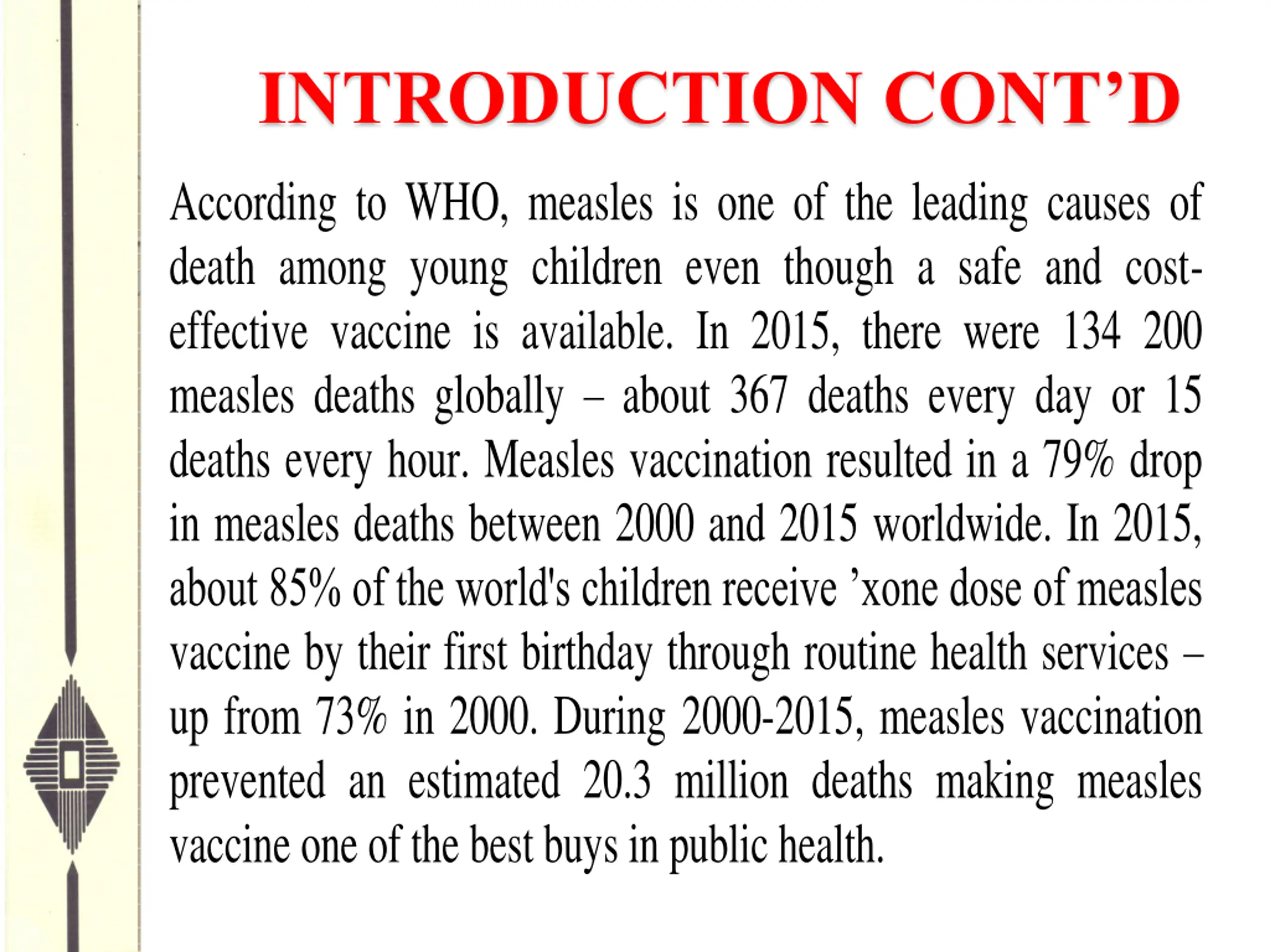 INTRODUCTION CONTD According to WHO, measles is one of the leading causes of death among young children even though a safe and cost- effective vaccine is available. In 2015, there were 134 200 measles deaths globally about 367 deaths every day or 15 deaths every hour. Measles vaccination resulted in a 79% drop in measles deaths between 2000 and 2015 worldwide. In 2015, about 85% of the world's children receive xone dose of measles vaccine by their first birthday through routine health services up from 73% in 2000. During 2000-2015, measles vaccination prevented an estimated 20.3 million deaths making measles vaccine one of the best buys in public health.