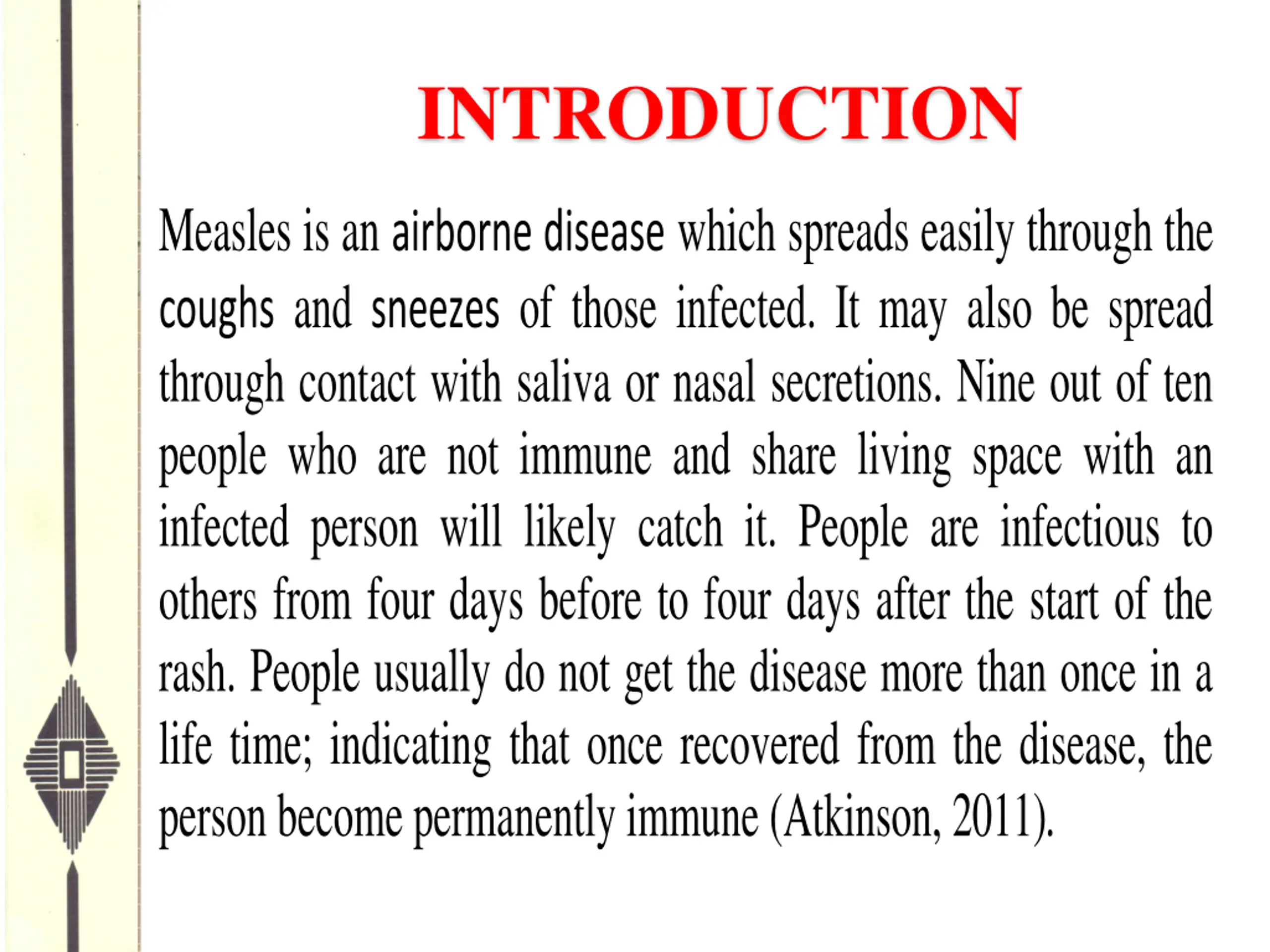 INTRODUCTION Measles is an airborne disease which spreads easily through the coughs and sneezes of those infected. It may also be spread through contact with saliva or nasal secretions. Nine out of ten people who are not immune and share living space with an infected person will likely catch it. People are infectious to others from four days before to four days after the start of the rash. People usually do not get the disease more than once in a life time; indicating that once recovered from the disease, the person become permanently immune (Atkinson, 2011).