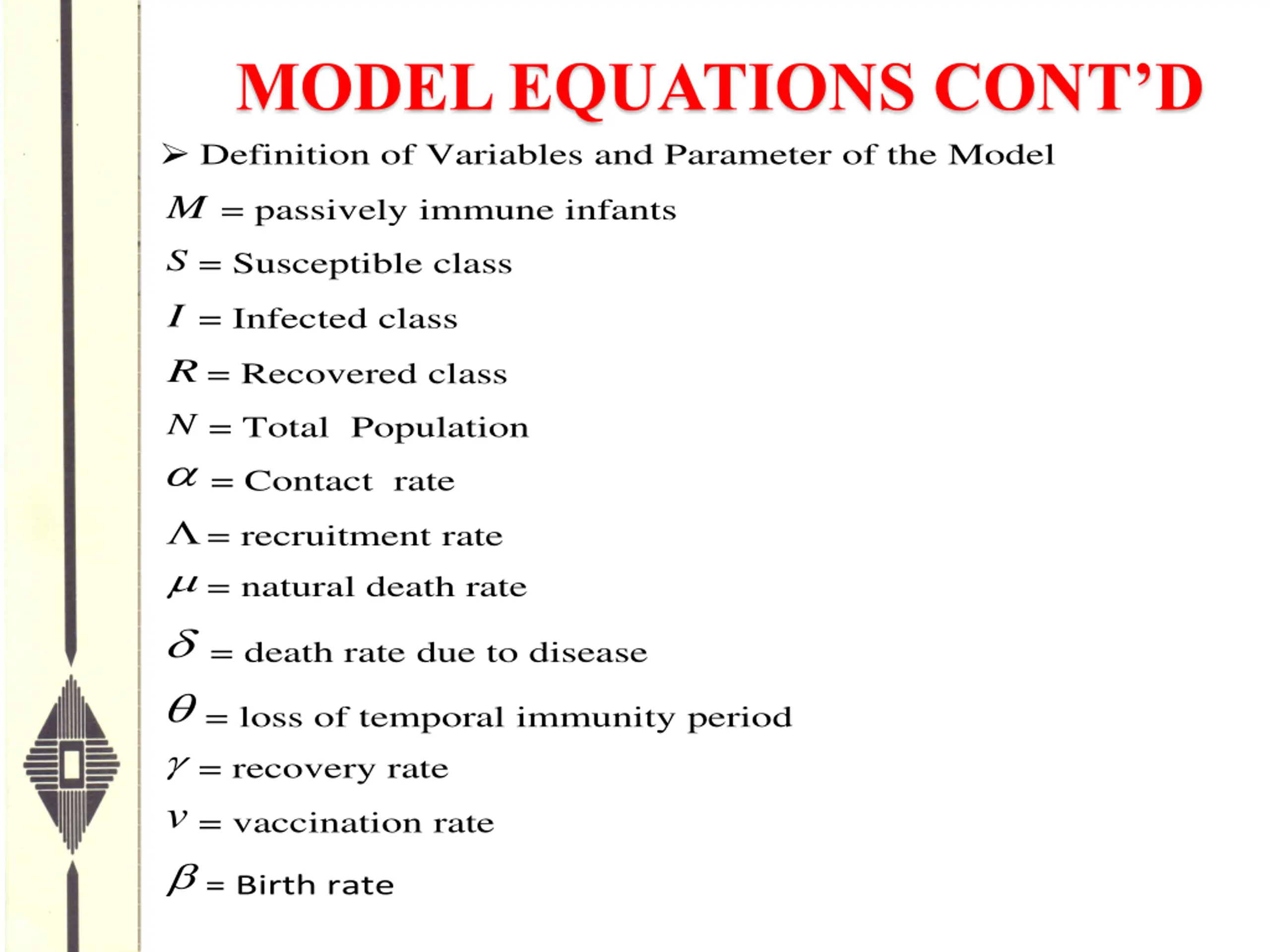 MODEL EQUATIONS CONTD Definition of Variables and Parameter of the Model M = passively immune infants S = Susceptible class I = Infected class R = Recovered class N = Total Population = Contact rate = recruitment rate = natural death rate = death rate due to disease = loss of temporal immunity period = recovery rate v= vaccination rate = Birth rate