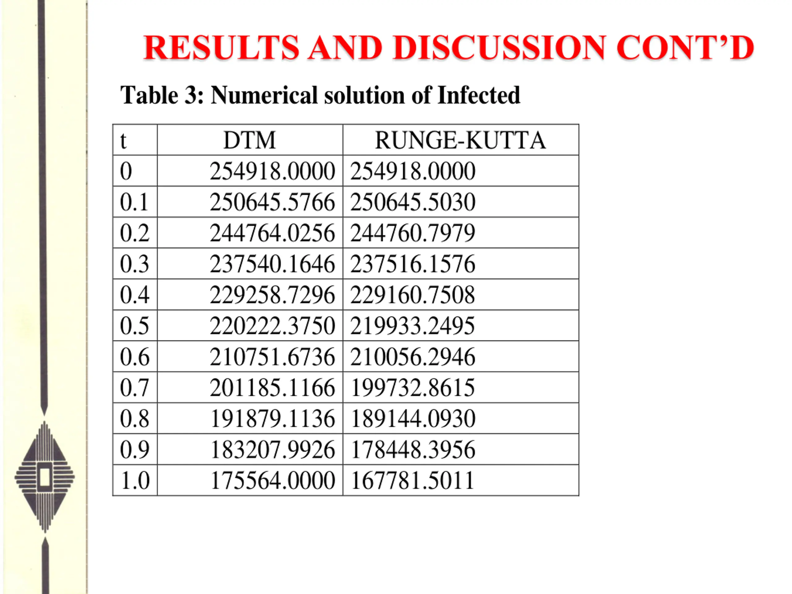 RESULTS AND DISCUSSION CONTD Table 3: Numerical solution of Infected t 0 0.1 0.2 0.3 0.4 0.5 0.6 0.7 0.8 0.9 1.0 DTM 254918.0000 254918.0000 250645.5766 250645.5030 244764.0256 244760.7979 237540.1646 237516.1576 229258.7296 229160.7508 220222.3750 219933.2495 210751.6736 210056.2946 201185.1166 199732.8615 191879.1136 189144.0930 183207.9926 178448.3956 175564.0000 167781.5011 RUNGE-KUTTA