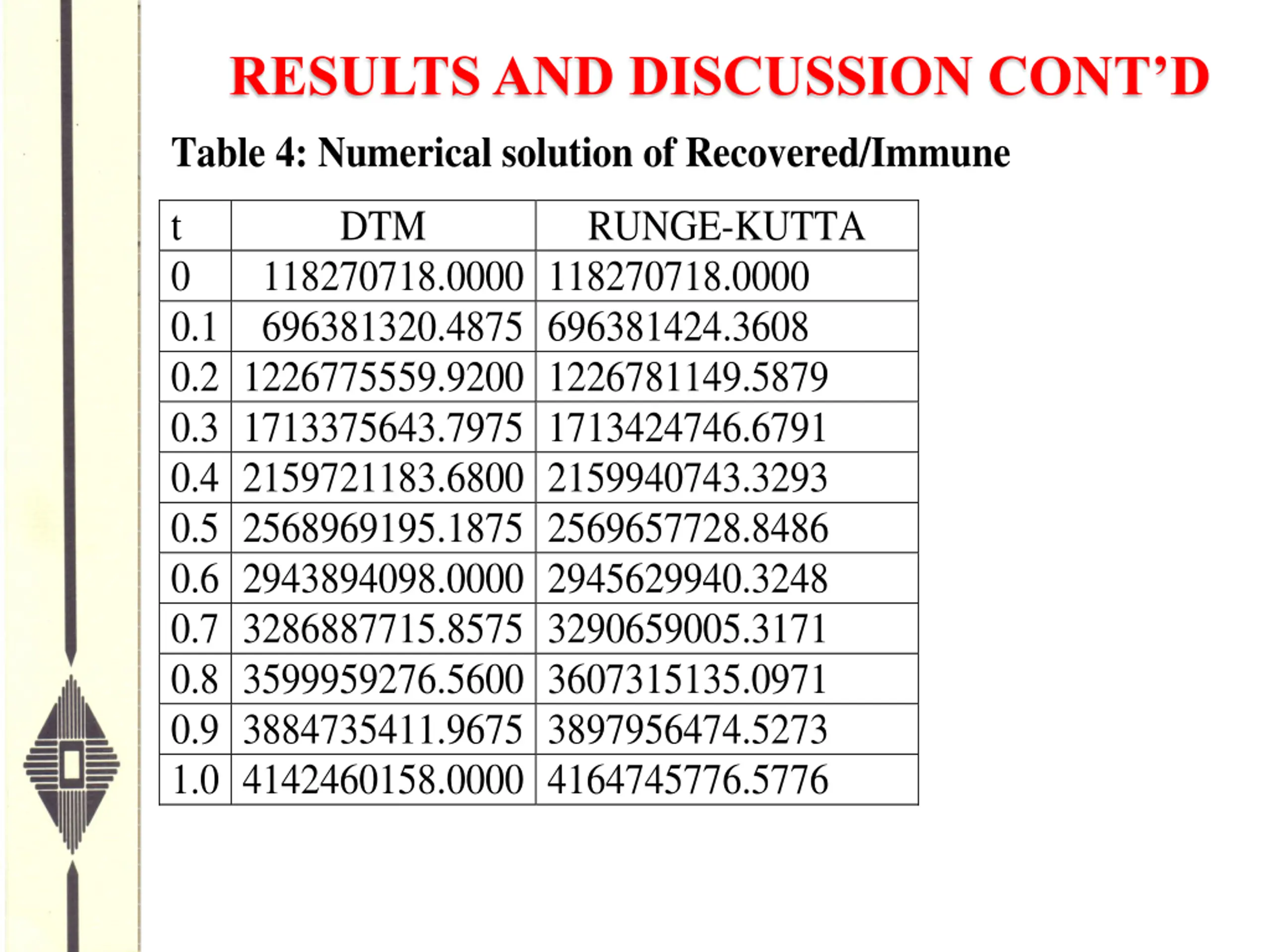RESULTS AND DISCUSSION CONTD Table 4: Numerical solution of Recovered/Immune t 0 0.1 696381320.4875 696381424.3608 0.2 1226775559.9200 1226781149.5879 0.3 1713375643.7975 1713424746.6791 0.4 2159721183.6800 2159940743.3293 0.5 2568969195.1875 2569657728.8486 0.6 2943894098.0000 2945629940.3248 0.7 3286887715.8575 3290659005.3171 0.8 3599959276.5600 3607315135.0971 0.9 3884735411.9675 3897956474.5273 1.0 4142460158.0000 4164745776.5776 DTM RUNGE-KUTTA 118270718.0000 118270718.0000