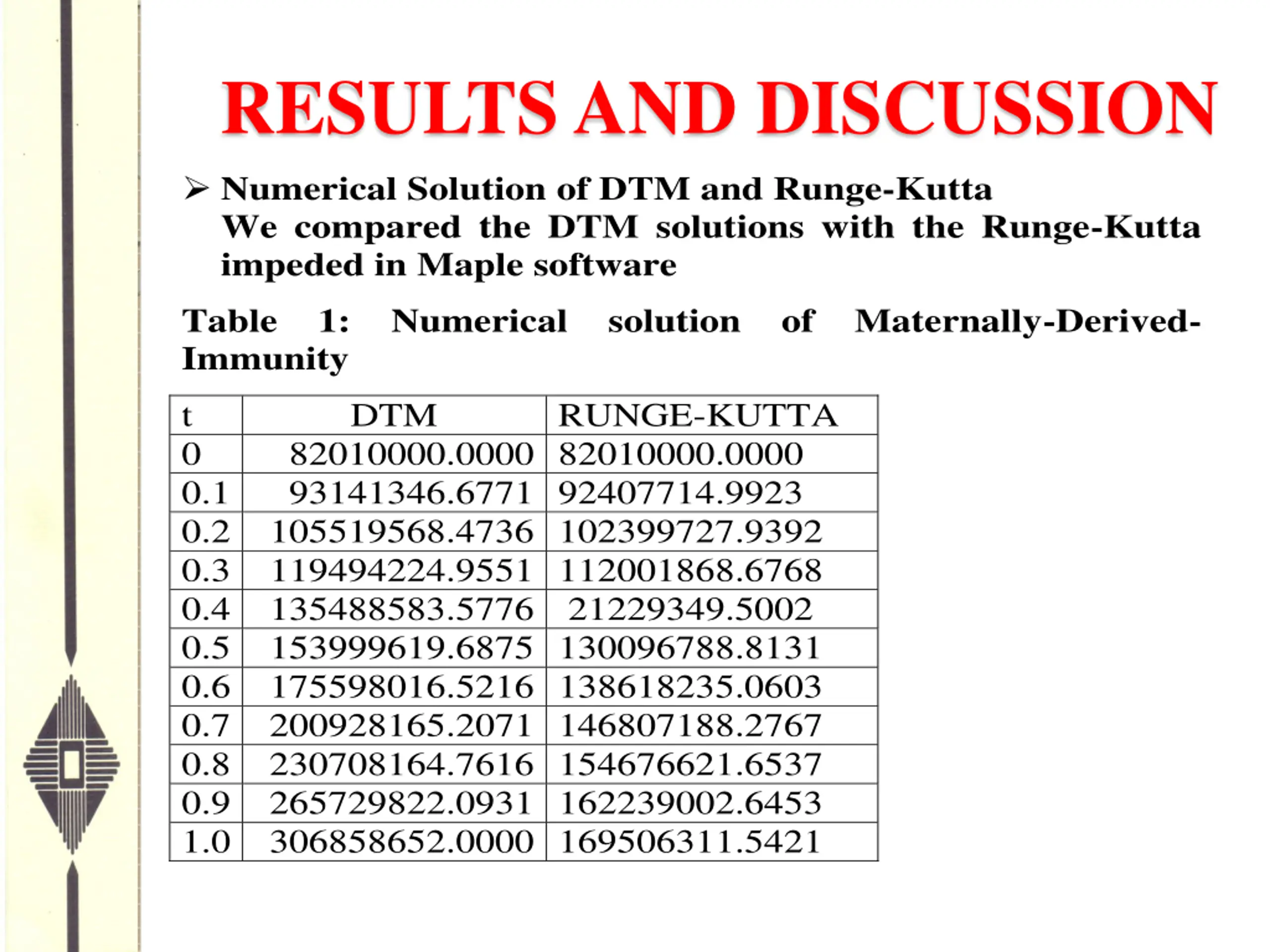 RESULTS AND DISCUSSION Numerical Solution of DTM and Runge-Kutta We compared the DTM solutions with the Runge-Kutta impeded in Maple software Table 1: Numerical solution of Maternally-Derived- Immunity t 0 0.1 0.2 105519568.4736 102399727.9392 0.3 119494224.9551 112001868.6768 0.4 135488583.5776 21229349.5002 0.5 153999619.6875 130096788.8131 0.6 175598016.5216 138618235.0603 0.7 200928165.2071 146807188.2767 0.8 230708164.7616 154676621.6537 0.9 265729822.0931 162239002.6453 1.0 306858652.0000 169506311.5421 DTM RUNGE-KUTTA 82010000.0000 82010000.0000 93141346.6771 92407714.9923