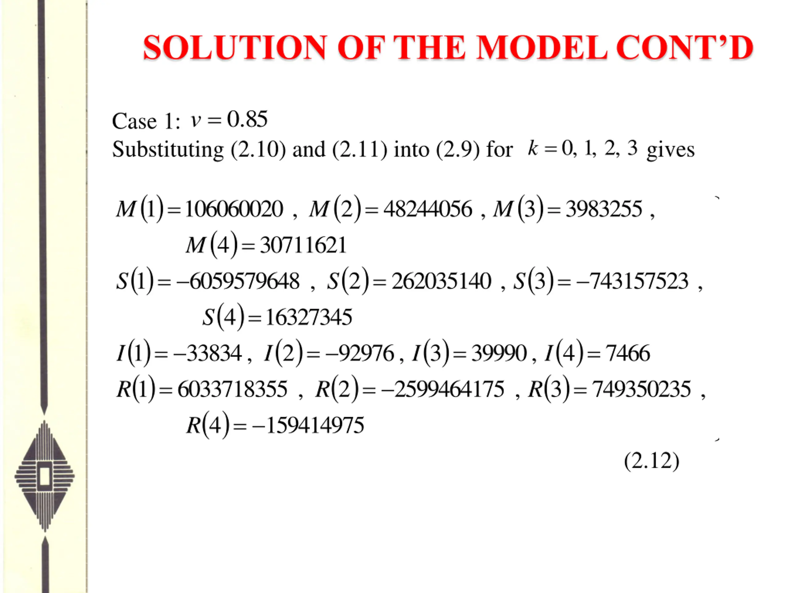 SOLUTION OF THE MODEL CONTD = . 0 50 v Case 2: Substituting (2.10) and (2.11) into (2.9) for ( ) ( ) ( ) ( ) ( ) ( ) ( ) ( ) = 19186708 4 R = , 0 , 1 , 2 3 k gives ( ) 2 ( ) 3 = = = 1 106060020 M , 48244056 , 3983255 , M M M = 4 30711621 ( ) 2 ( ) 3 = = = 1 357476121 S , 928743534 , 150994477 , S S S = , 4 16327345 I ( ) 3 ( ) = = 3548905828 = = = 1 33834 2 53929 , 17085 , 4 3220 I I I ( ) 2 ( ) 3 = = 1 , 907895354 , 157203194 , R R R (2.14)