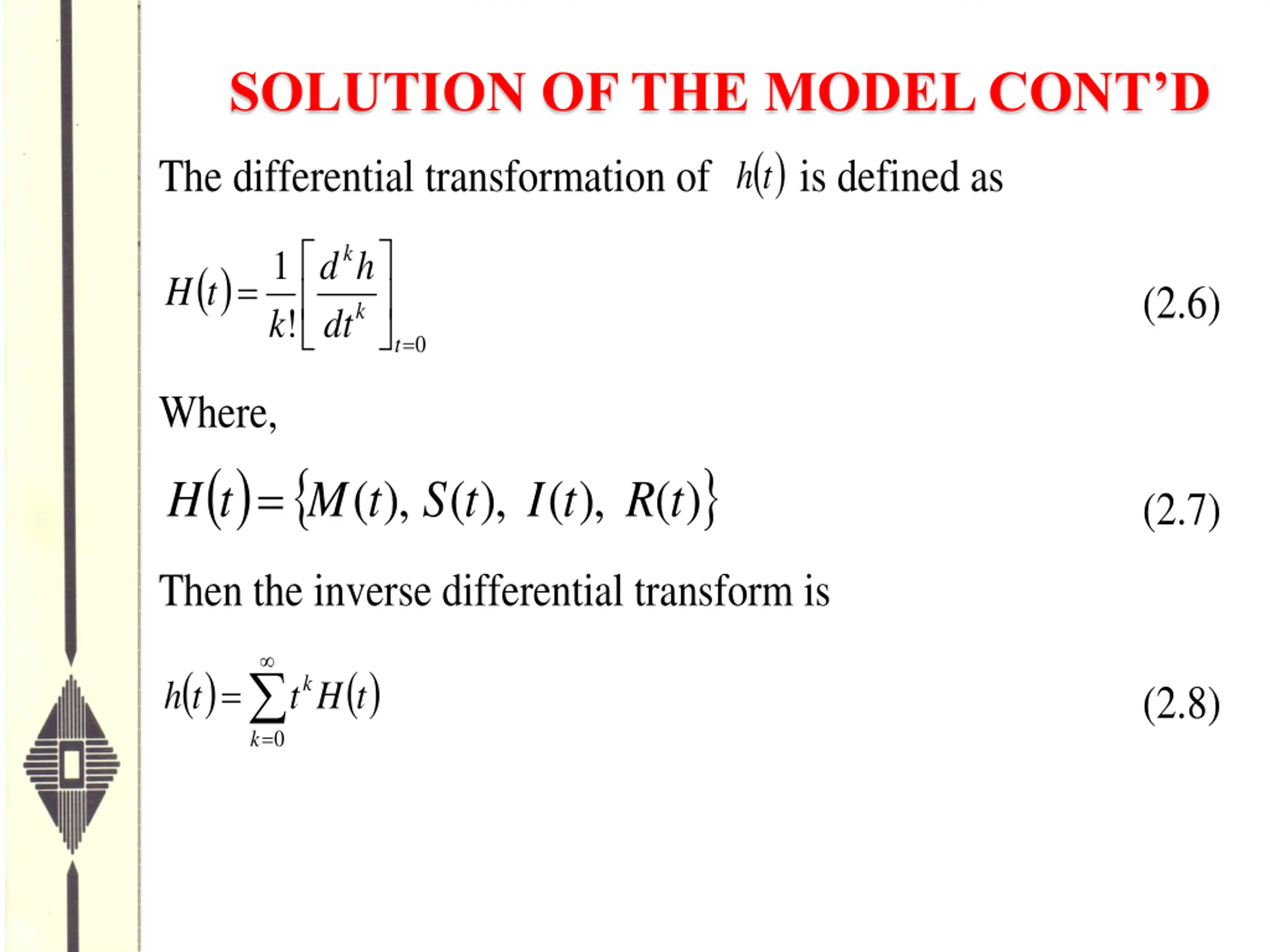 SOLUTION OF THE MODEL CONTD The differential transformation of ( ) t h is defined as k 1 k d h ( ) t = H (2.6) k ! dt = 0 t Where, ( ) t H ) t = ( ), ( ), ( ), ( M t S t I t R (2.7) Then the inverse differential transform is ( ) t ( ) t = = k h t H (2.8) 0 k