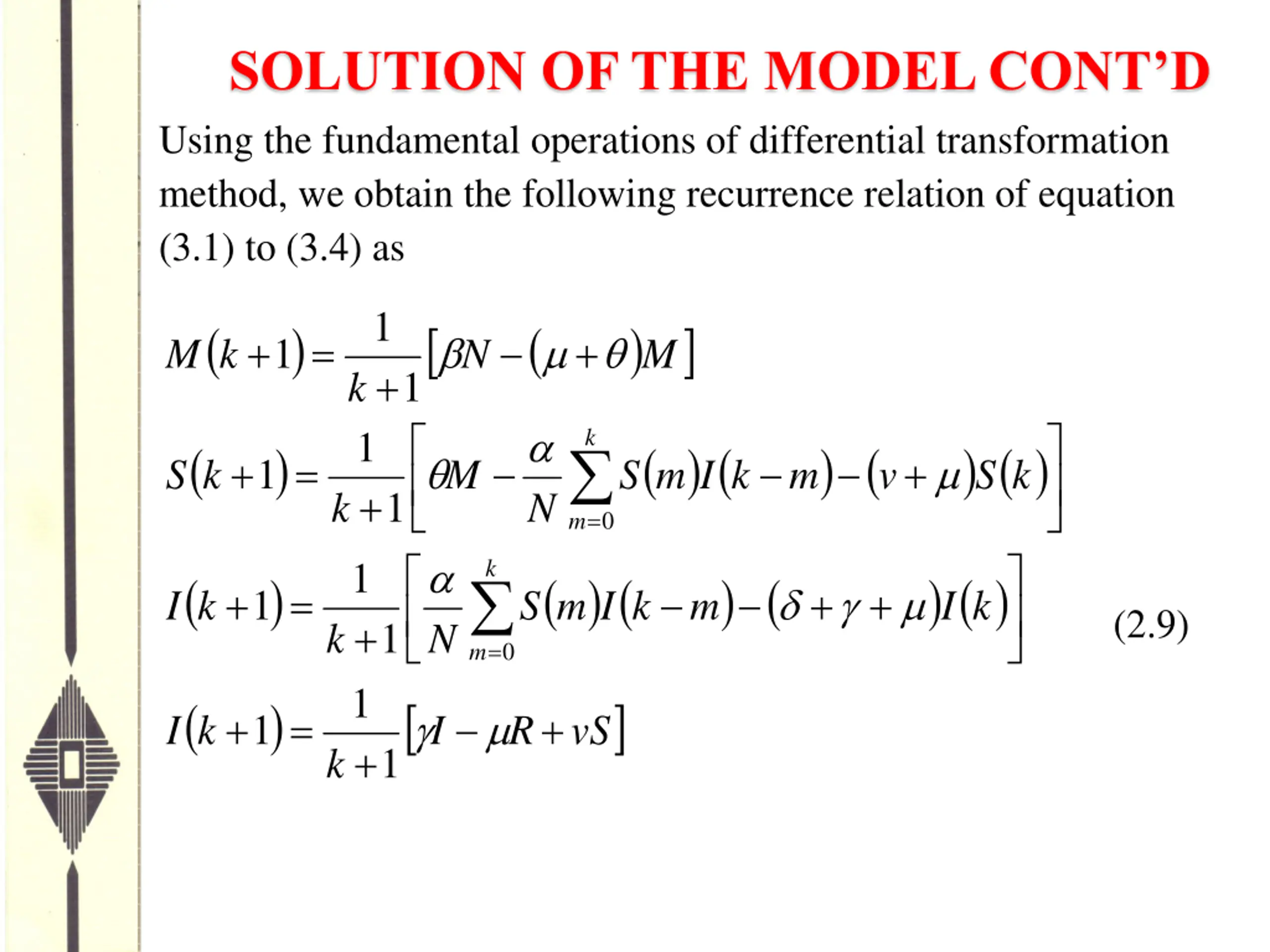 SOLUTION OF THE MODEL CONTD Using the fundamental operations of differential transformation method, we obtain the following recurrence relation of equation (3.1) to (3.4) as 1 ( ) ( ) + = + 1 M k N M + 1 k 1 k ( ) ( ) ( m ) ( ) ( ) S = + = + 1 S k M S I k m v k + 1 k N 0 m 1 k ( ) ( ) ( m ) ( ) ( ) I = + = + + 1 I k S I k m k (2.9) + 1 1 k N 0 m ( ) + = + 1 I k I R vS + 1 k